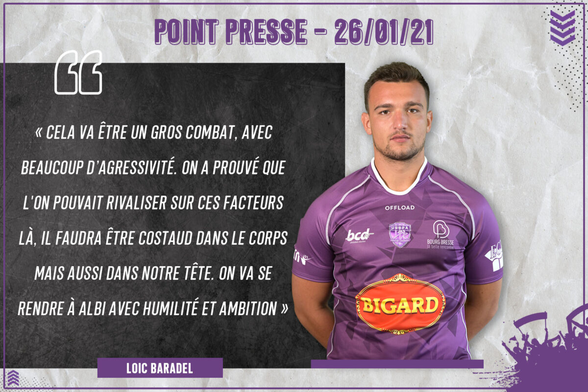 Arnaud Perret, centre de l’USBPA Rugby, pose les bases de cette rencontre de haute volée : « C’est un match de haut niveau qui nous attend avec un gros combat physique, de niveau Pro D2. On y va pour gagner ! On a une bonne semaine d’entraînement et il va falloir nous appuyer sur notre défense efficace. Dijon ? C’est frustrant du point de vue du bonus, c’est sûr. En Nationale, c’est très serré et il y a beaucoup de matchs de haut niveau. En ce qui concerne la suite du championnat, c’est pas évident. On prend ce que l’on nous donne, en fonction des directives gouvernementales. On a déjà la chance de pouvoir jouer mais c’est clair que le public nous manque« .