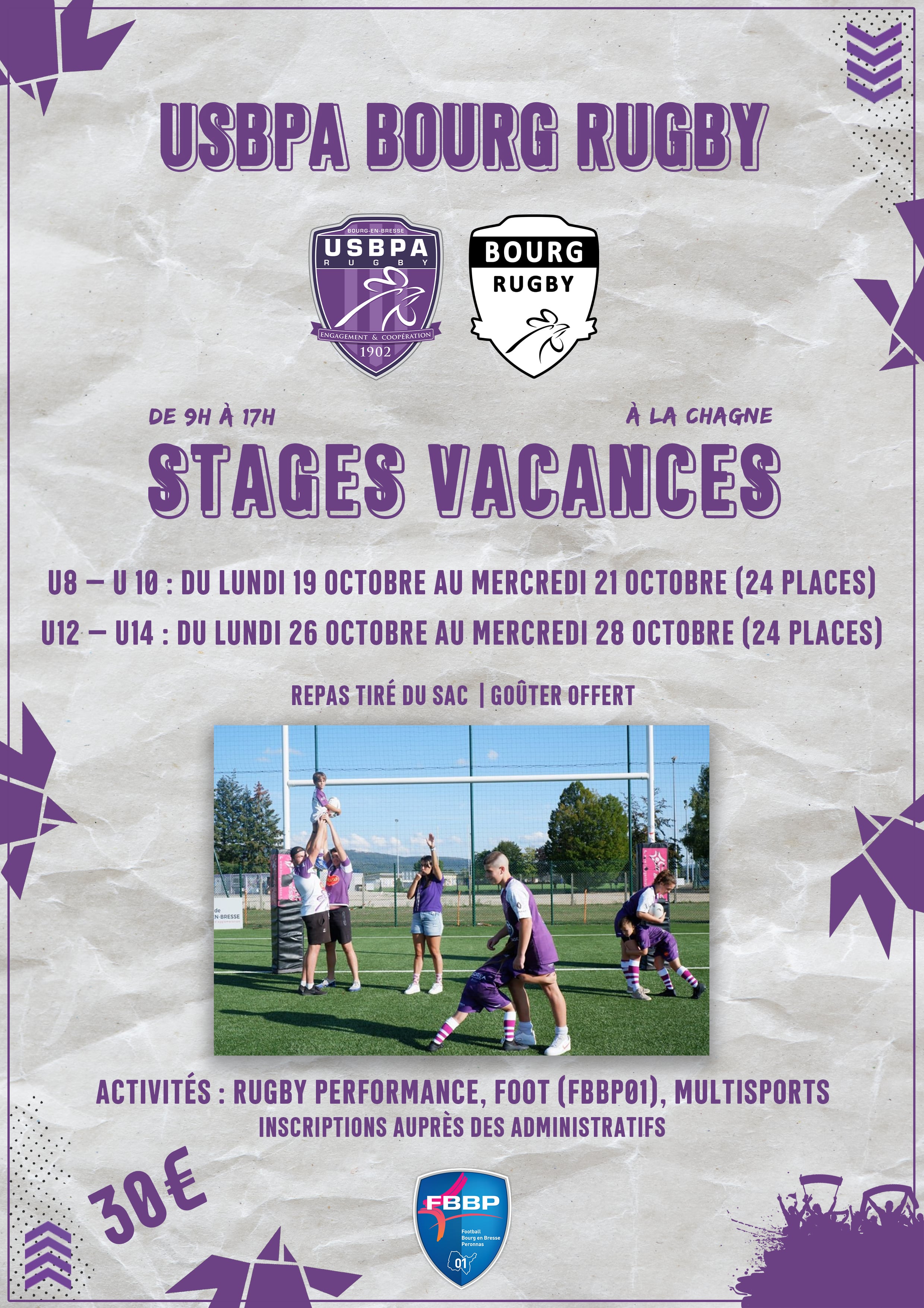 L’Association organise des « Stages Vacances » sur le complexe sportif de la Chagne ! Au programme : Rugby Performance, pratique du Football conjointement menée avec le FBBP01 et multisports !