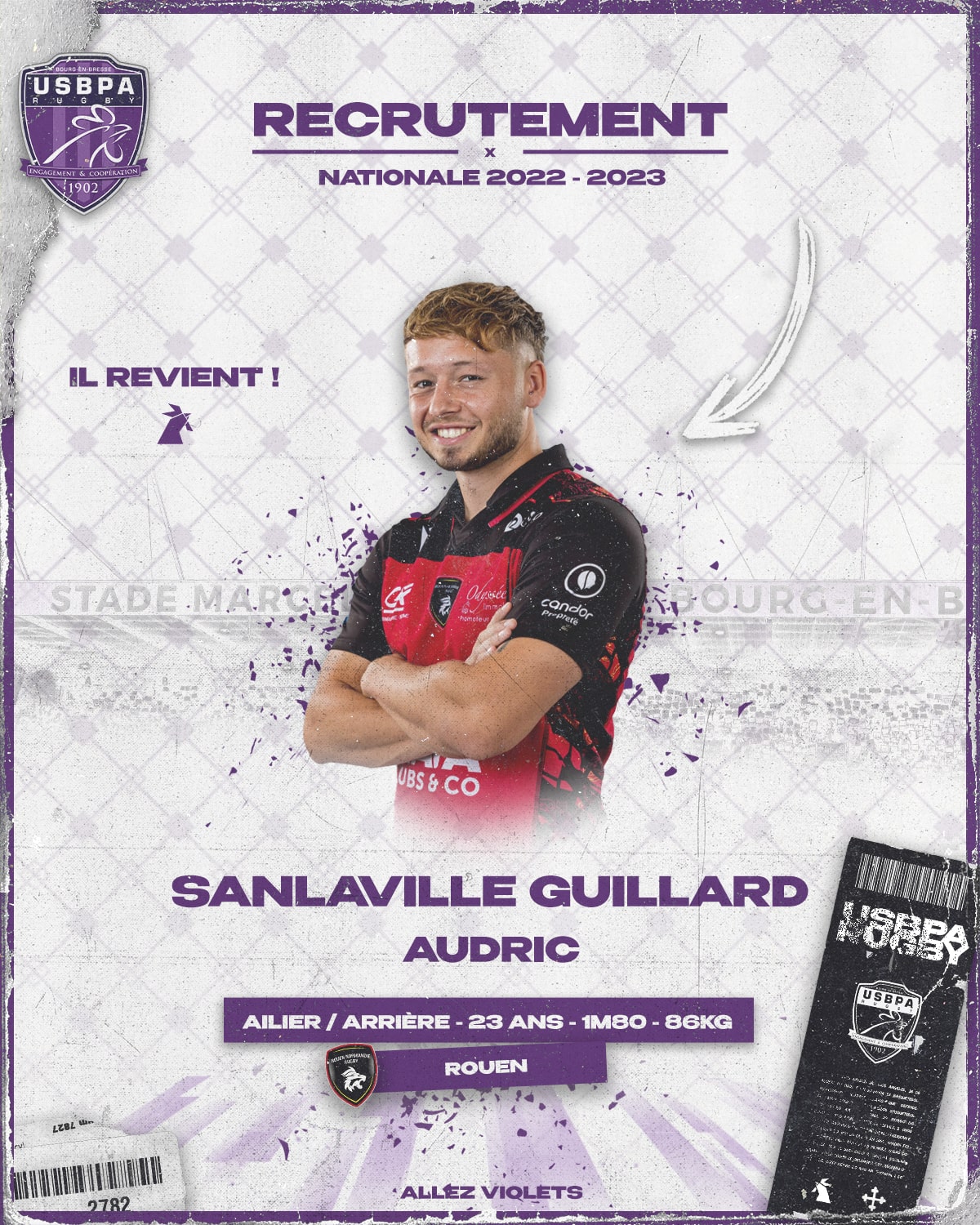 L’USBPA Rugby et son partenaire Laforêt Bourg en Bresse vous annoncent le retour au club d’Audric Sanlaville, en provenance de Rouen ! Un an après avoir quitté l’USB, Audric revient donc à l’USBPA Rugby ! Recruté en tant que 3/4 polyvalent (ailier ou arrière), le jeune homme de 23 ans s’est engagé pour deux saisons à Bourg (+1 en option) !