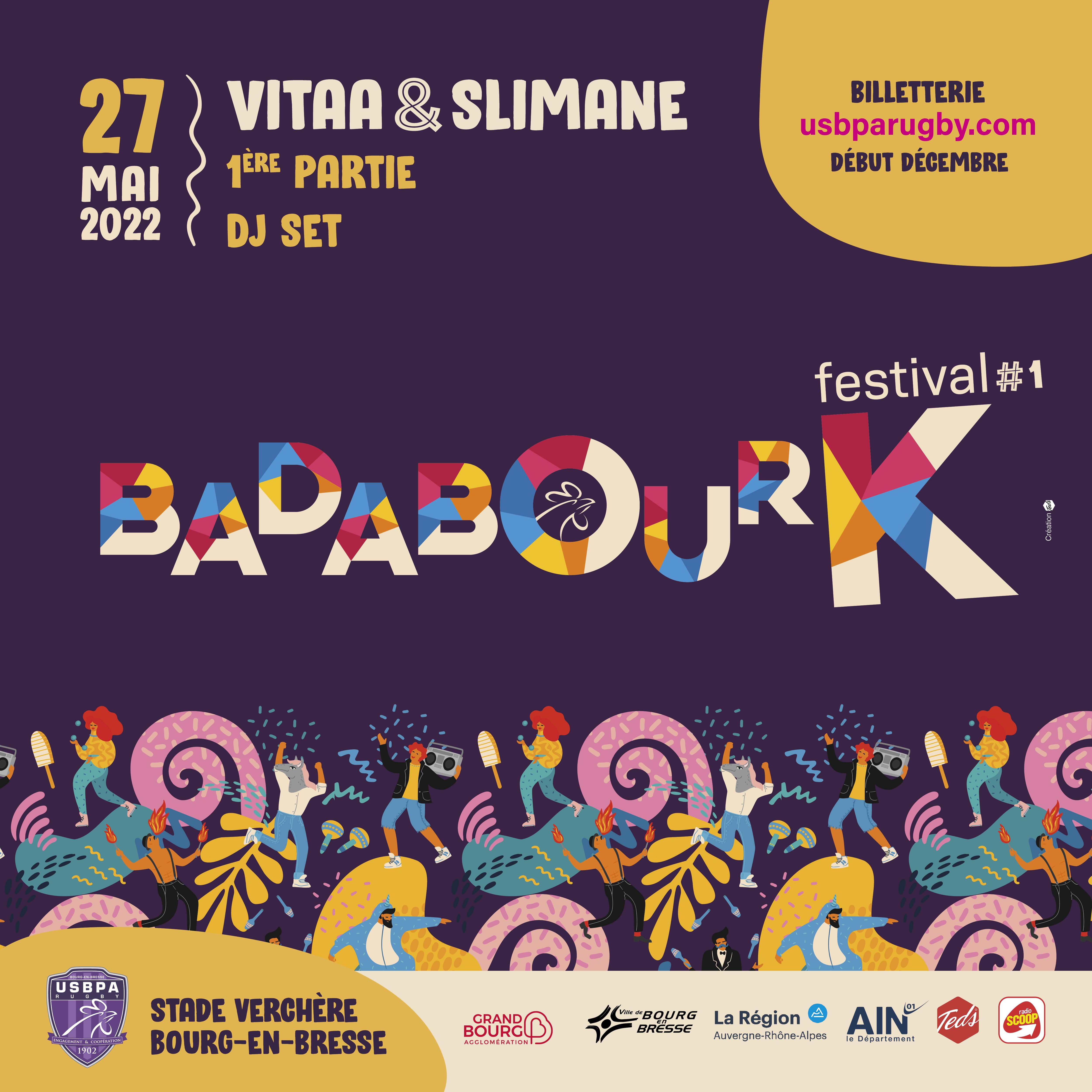 Une grande première pour votre club de l’Union Sportive Bressane Pays de l’Ain qui organise son premier festival au stade Marcel Verchère. Un festival plein de surprises aux portes de l’été ! Seront présents au BADABOURK FESTIVAL Vitaa et Slimane récompensés à la 22ème cérémonie des NRJ Music Awards durant laquelle ils ont remporté trois prix, celui de la « Chanson Francophone de l’Année » avec leur titre « Avant toi », « Groupe Francophone de l’Année » et du « Clip de l’Année » avec leur titre « Ça ira ». Une première partie et un DJ Set en clôture du festival seront assurés par des artistes dont les noms seront dévoilés ultérieurement.