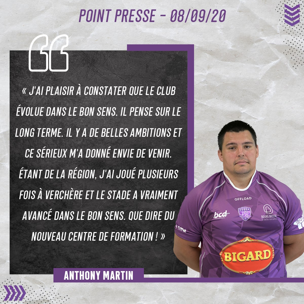 « J’ai plaisir à constater que le club évolue dans le bon sens. Il pense sur le long terme. Il y a de belles ambitions et ce sérieux m’a donné envie de venir. Étant de la région, j’ai joué plusieurs fois à Verchère et le stade a vraiment avancé dans le bon sens. Que dire du nouveau centre de formation ! En plus le club a son gros vivier de supporters, pour l’avoir vécu contre moi (Anthony jouait à Rouen lors de la finale d’accession en 2018) on a vraiment l’impression de prendre un mur à Verchère » Au sujet de la reprise du championnat, le pilier annonce que : « Toute l’équipe a hâte, on l’a vu sur les amicaux. La préparation physique c’est une chose, mais on a vraiment envie de retrouver la compétition. L’intégration s’est bien passée, devant, nous sommes que deux recrues au milieu d’une quinzaine de joueurs donc ça va vite pour prendre le pli. »