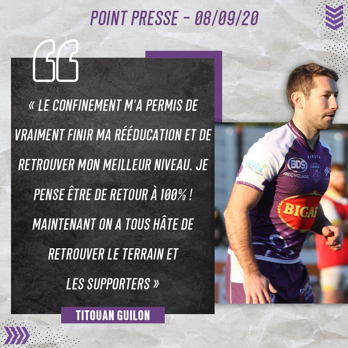 Le numéro 9 de l’USBPA, blessé gravement en début de saison 2019/2020 va enfin pouvoir retrouver la compétition officielle : « Le confinement m’a permis de vraiment finir ma rééducation et de retrouver mon meilleur niveau. Je pense être de retour à 100%. » Le demi de mêlée continue : « Je suis impatient de rejouer à Verchère et de retrouver l’ambiance d’un match à domicile. Concernant Blagnac, on va devoir rester vigilants. »