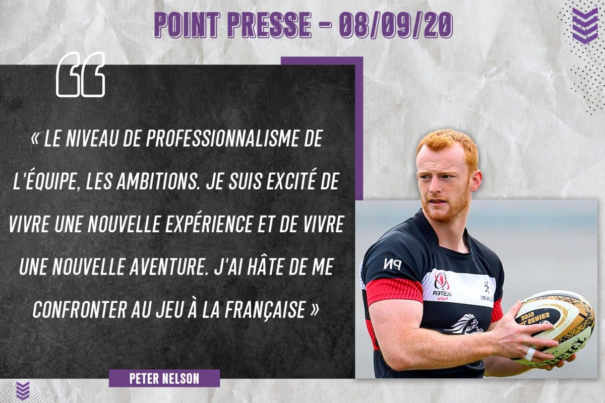 Les Violets ont le plaisir d’enregistrer l’arrivée de Peter Nelson, afin de palier aux blessures récentes de longues durée de Mathis Viard et Benjamin Doy. Vous pouvez retrouver sa présentation ici. Yoann Boulanger nous livre ses premières impressions en quelques mots : « Peter Nelson a une grosse expérience du haut-niveau. Il a joué la dernière Coupe du Monde avec le Canada. Il a également joué avec l’Ulster. Il a une bonne technique au pied comme à la main, qu’il nous a montrée pendant la semaine de test à l’entraînement. » Peter, de son côte se montre ravi par : « Le niveau de professionnalisme de l’équipe, les ambitions. Je suis excité de vivre une nouvelle expérience et de vivre une nouvelle aventure. J’ai hâte de me confronter au jeu à la Française. » Les formalités administratives sont en cours, néanmoins il ne devrait pas pouvoir jouer dès ce week-end.