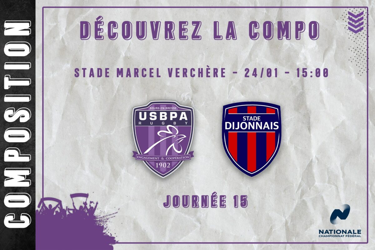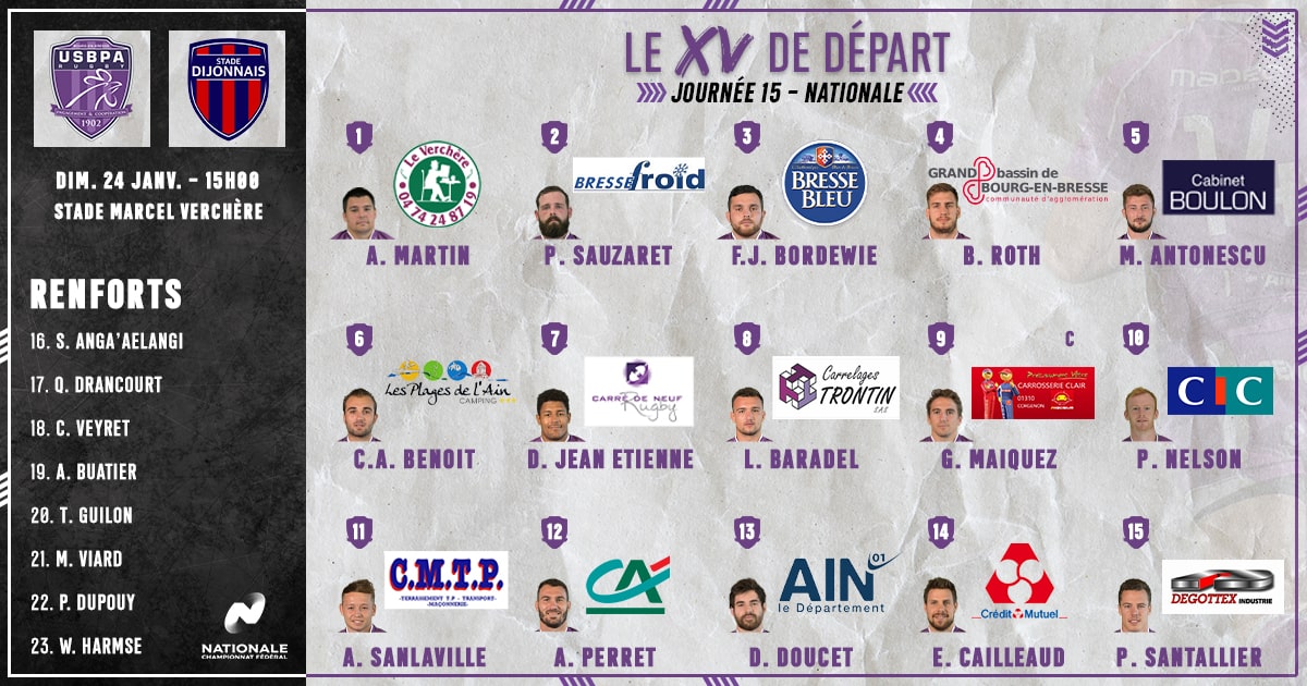 Découvrez la composition de l’USBPA Rugby pour affronter Dijon ce dimanche à 15h30 au stade Marcel Verchère ! Ce match comptera pour la journée 15 de Nationale et la rencontre sera jouée à huis clos. Cependant, le match sera filmé par le club et retransmis sur Facebook !