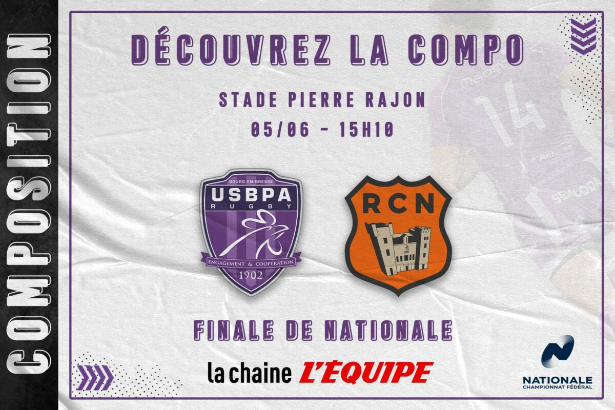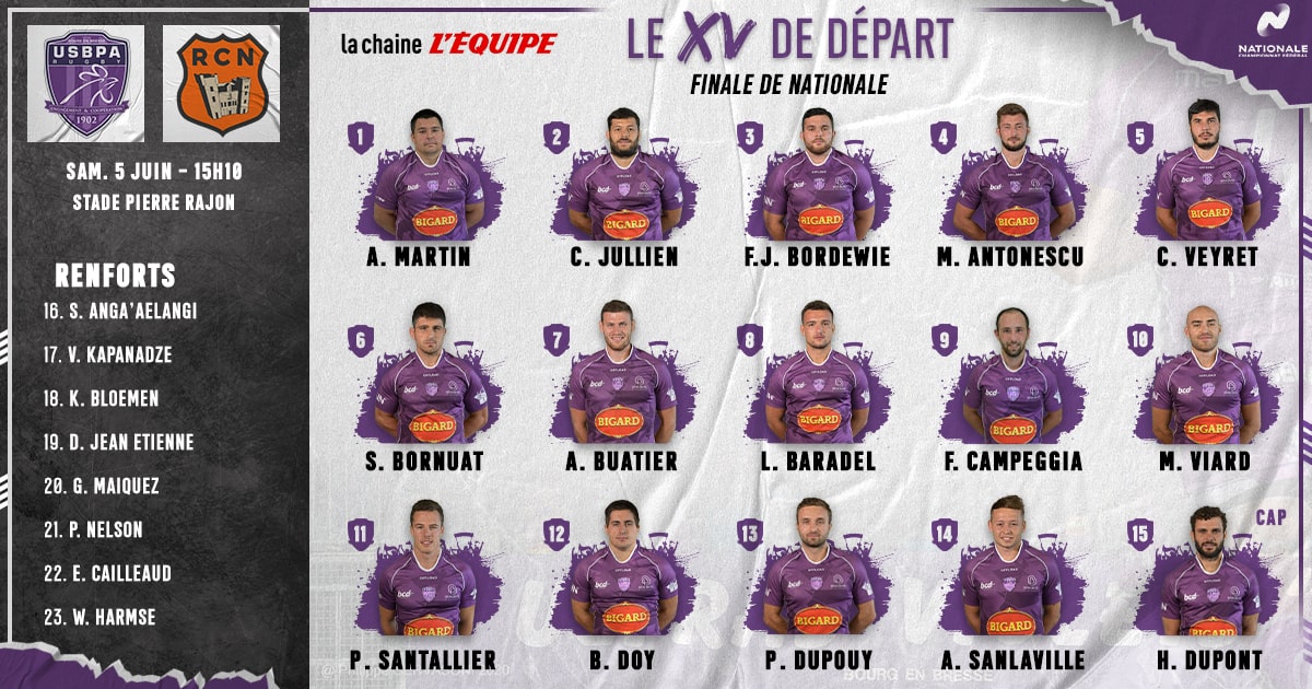 Découvrez la composition de l’USBPA Rugby pour affronter le RC Narbonnais ce samedi 5 juin à 15h10 au stade Pierre Rajon de Bourgoin-Jallieu ! Ce dernier match de la saison sera diffusé en direct et en clair sur La Chaîne L’Équipe, avec en jeu : le titre de champion de France de Nationale !
