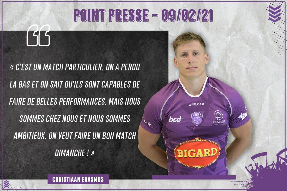 De retour d’une longue blessure au dos, Christiaan prétend à une place dans le groupe pour ce week-end : « C’est un match particulier, on a perdu là-bas et on sait qu’ils sont capables de faire de belles performances. Mais nous sommes chez nous et nous sommes ambitieux. On veut faire un bon match dimanche ! On a pas montré notre vrai visage comme l’a dit Adrien, et on a bien révisé pour êtres performants ».