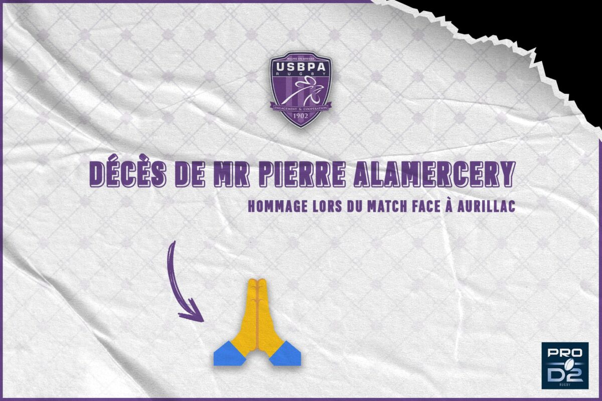 Le club rendre hommage ce soir au coup d’envoi à Pierre Alamercery dit « Pierrot », ancien joueur et champion de France en 1966, puis entraineur des équipes cadets et juniors dans les années 70-80. Il a également été dirigeant, d’une nature discrète, toujours humble et efficace dans son travail, il a été un grand serviteur du rugby Violet et il assistait à tous les matchs avec les anciens dans la tribune Sénétaire. A toute sa famille, ses proches et ses amis, nous leur adressons nos plus sincères condoléances.