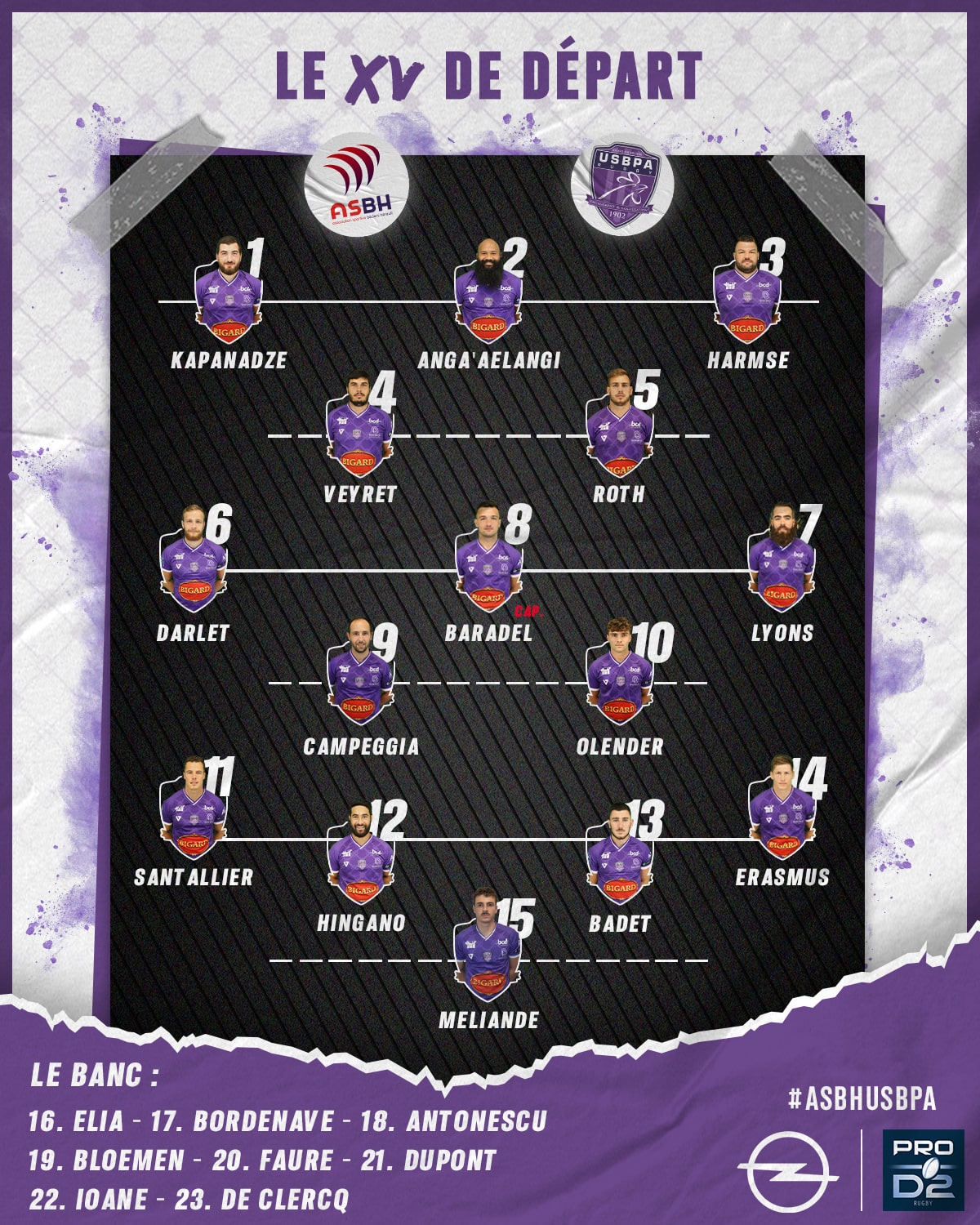 Opel Mondial Autos, concession à Péronnas, vous présente la composition d’équipe de l’USBPA Rugby qui sera alignée demain à 19h30 face à Béziers pour le compte de la Journée 28 de Pro D2 !