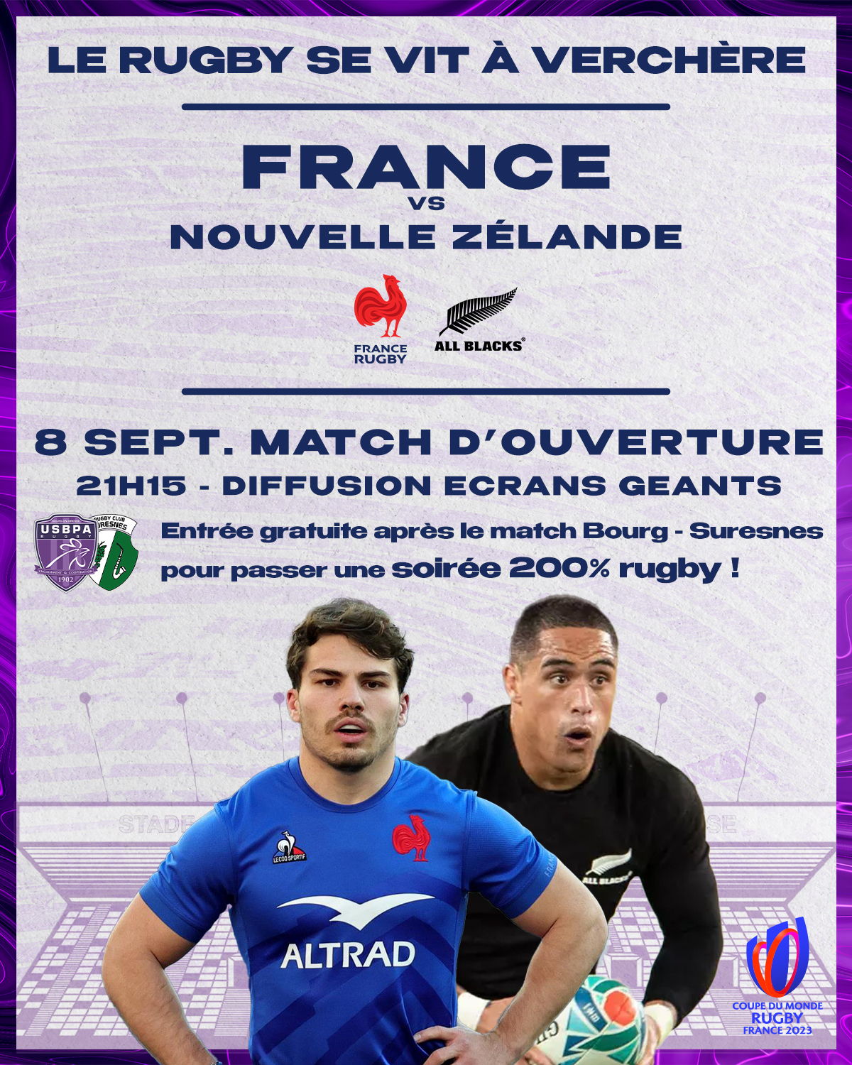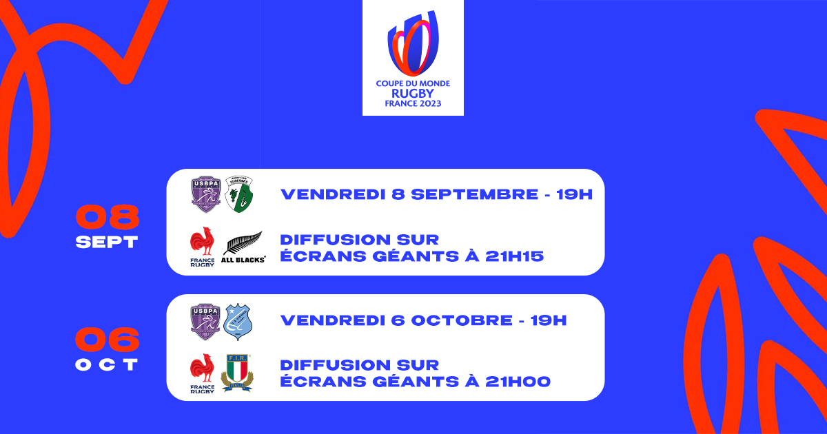 Les matchs de l’USBPA Rugby du 8 septembre (Suresnes) et du 6 octobre (Vienne) seront décalés à 19h00 au lieu de 19h30 initialement prévu. En effet, ces deux dates correspondent aux matchs de nos Bleus qui disputeront la tant convoitée Coupe du Monde de Rugby ! Ensemble, venez partager des moments uniques avec la Communauté Violette autour des matchs de Nationale et d’une compétition exceptionnelle organisée en France.