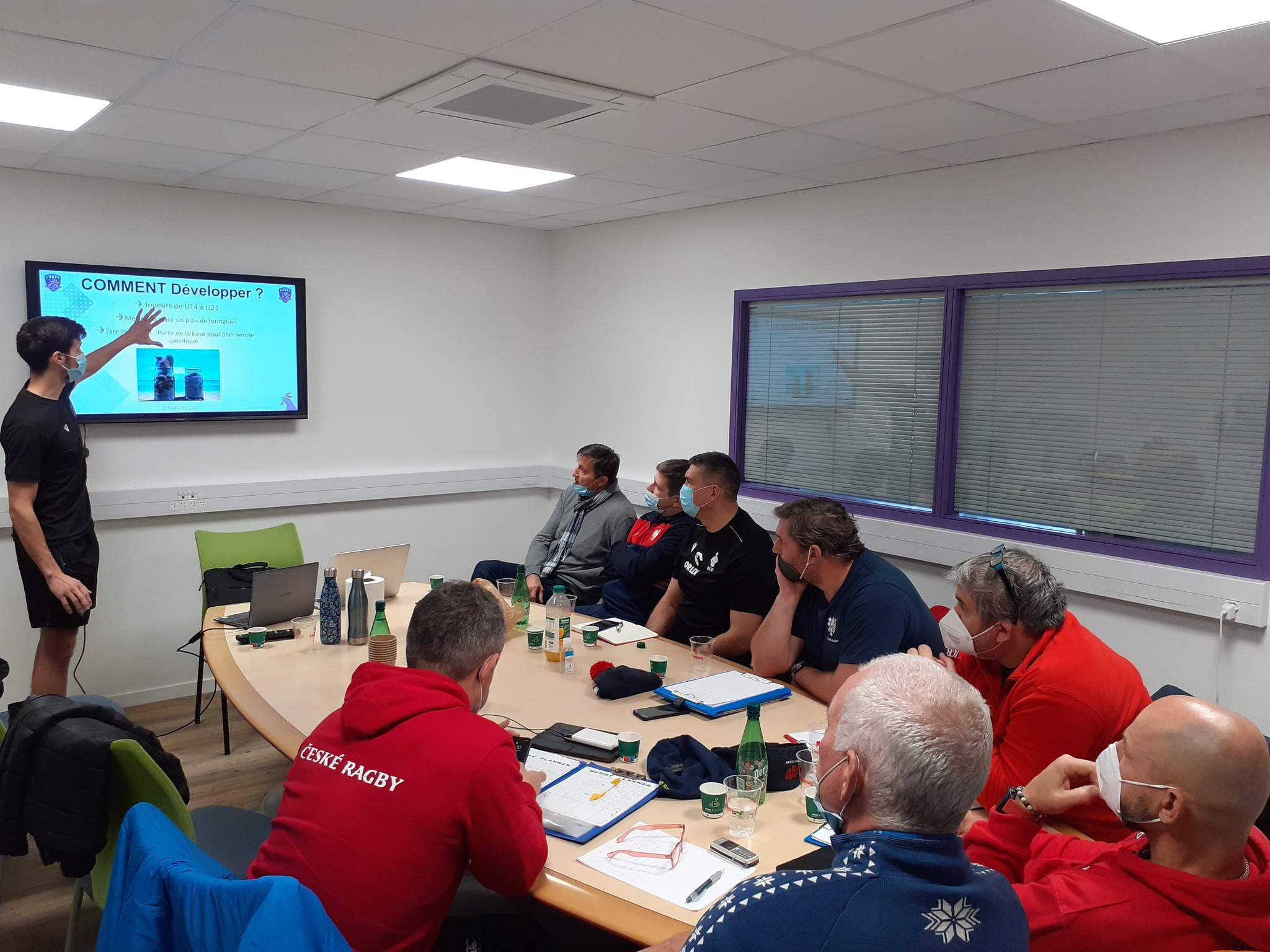 En stage dans la région Auvergne Rhône Alpes pour développer leur formation fédérale, ils ont pu accéder à l’organisation interne du club avec des présentations successives de Richard Savey (Responsable du Centre De Formation) sur la partie formation des Espoirs, Louis Philippon sur le développement physique des joueurs, puis Yoann Boulanger pour la partie professionnelle de l’USBPA Rugby. En fin de matinée, après avoir visité les locaux et les infrastructures de Verchère, ils ont pu assister à l’entrainement du groupe Pro.