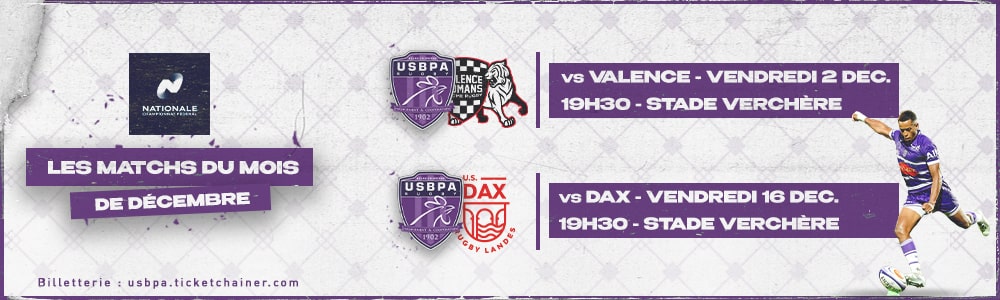 Valence-Romans puis Dax, un programme alléchant vous attend au stade Marcel Verchère avant les fêtes de fin d’année ! L’USBPA Rugby recevra le VRDR vendredi 2 décembre (19h30) et l’US Dax le vendredi 16 décembre (19h30) à domicile. Les Violets auront besoin de vous plus que jamais pour tenter de conserver leur invincibilité dans leur antre face à deux équipes qui occupent le trio de tête avec eux dans ce championnat de Nationale. Alors, prêts à vibrer avec nos Bressans ?