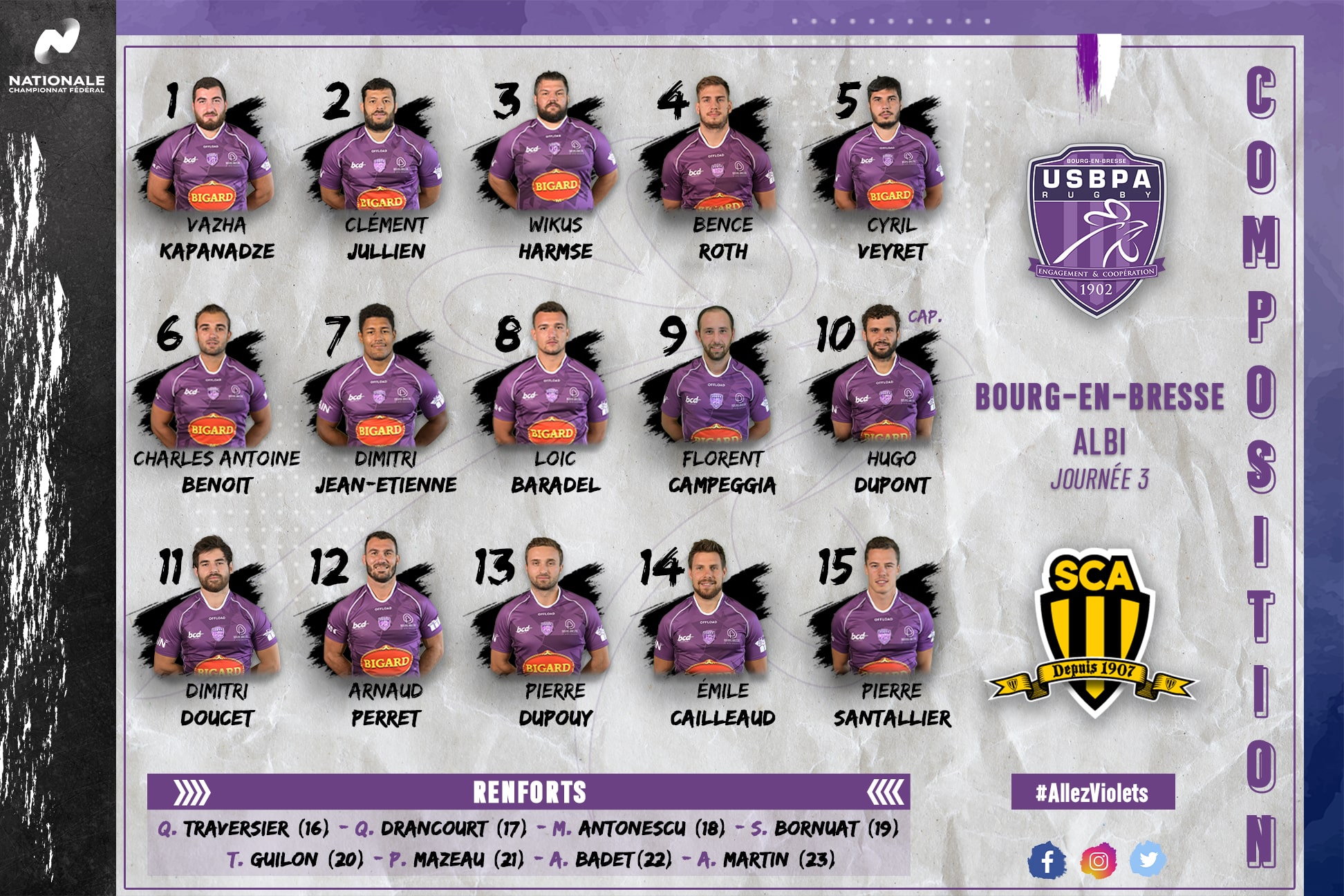 Découvrez la composition de l’USBPA pour affronter Albi au stade Verchère demain à 19h30 ! Nous vous demandons de continuer à respecter les mesures sanitaires en vigueur pour que la saison puisse se poursuivre normalement :