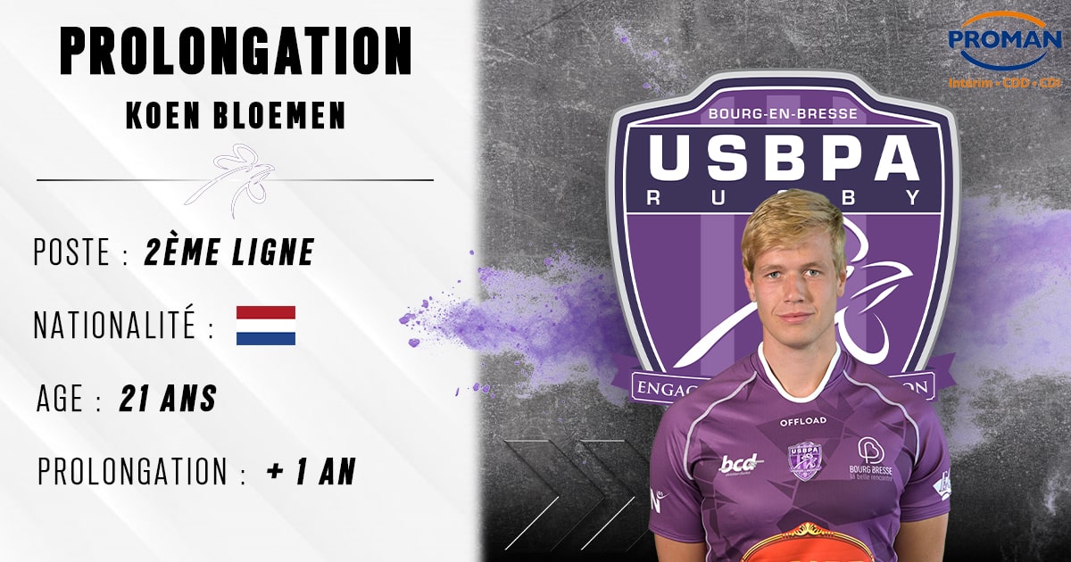 L’USBPA et Proman Bourg-en-Bresse vous annoncent la prolongation d’une saison, de Koen Bloemen, lui aussi, après une première saison réussie sous le maillot violet ! Le seconde ligne, international néerlandais, était en provenance de Montpellier.
