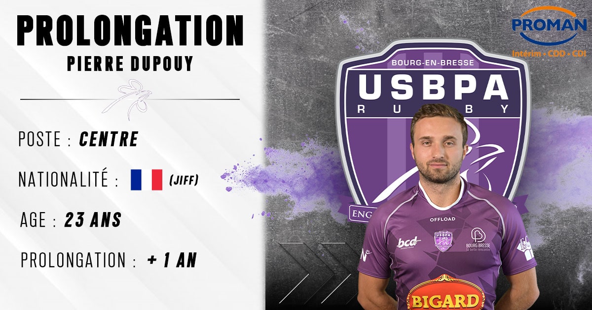 L’USBPA et Proman Bourg-en-Bresse vous annoncent la prolongation de Pierre Dupouy, pour une saison, plus une seconde en option, après une première saison réussie sous le maillot violet. Le centre français (JIFF) arrivait en provenance de Pau et était notamment passé par Auch.