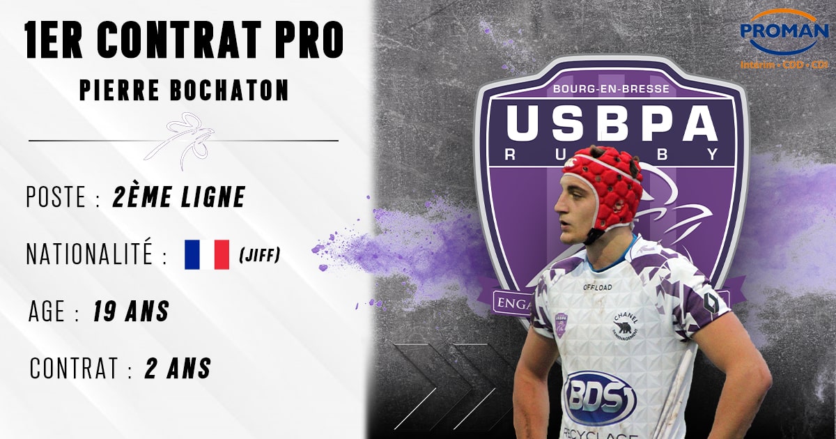 L’USBPA et Proman Bourg-en-Bresse vous annoncent la signature du premier contrat professionnel pour Pierre Bochaton ! Ce jeune deuxième ligne, formé au club, a déjà pu partager certains entraînements avec les pros durant la saison écoulée.