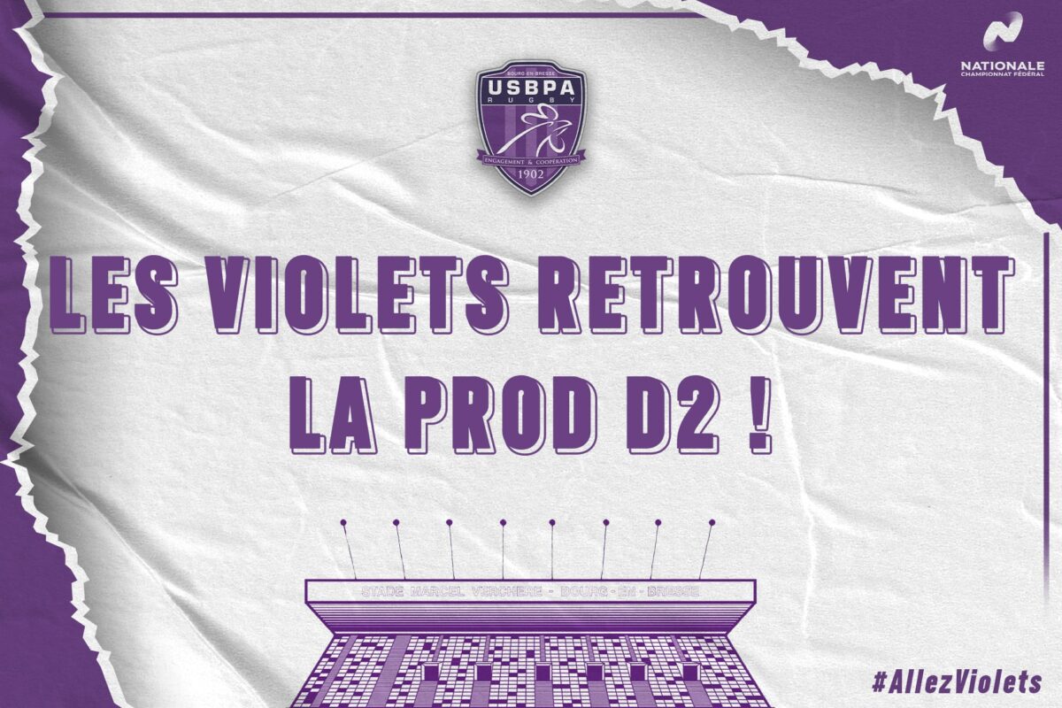 Les Violets remportent leur demi-finale de Nationale et accèdent à la PRO D2 ! Héroïques, nos Bressans ont écrit une nouvelle page de leur histoire, une nouvelle page de VOTRE histoire ! L’USBPA Rugby jouera donc en Pro D2 la saison prochaine et aura une finale à disputer la semaine prochaine pour tenter de conquérir le titre de Nationale !