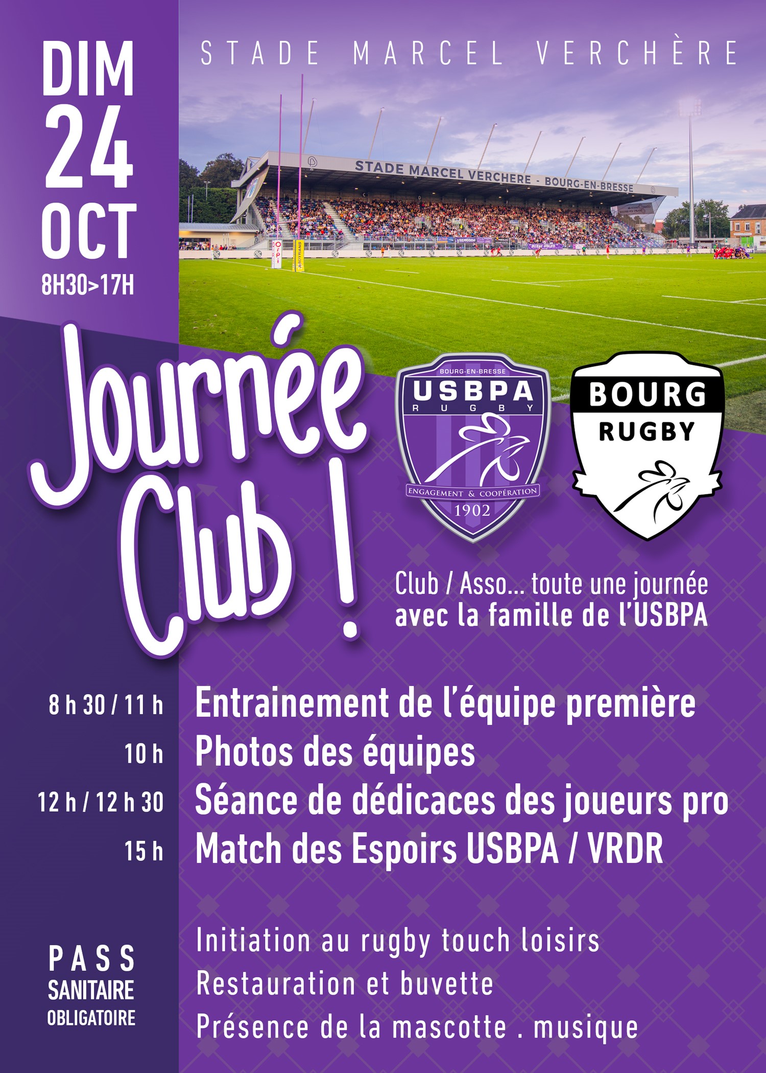 Ce dimanche, les Violets vous convient à la journée club au stade Marcel Verchère ! Au programme : entrainement de l’équipe pro, réalisation des photos des équipes jeunes, séance de dédicaces des joueurs pros, match des Espoirs face au VRDR (à 15h00) et plus encore !