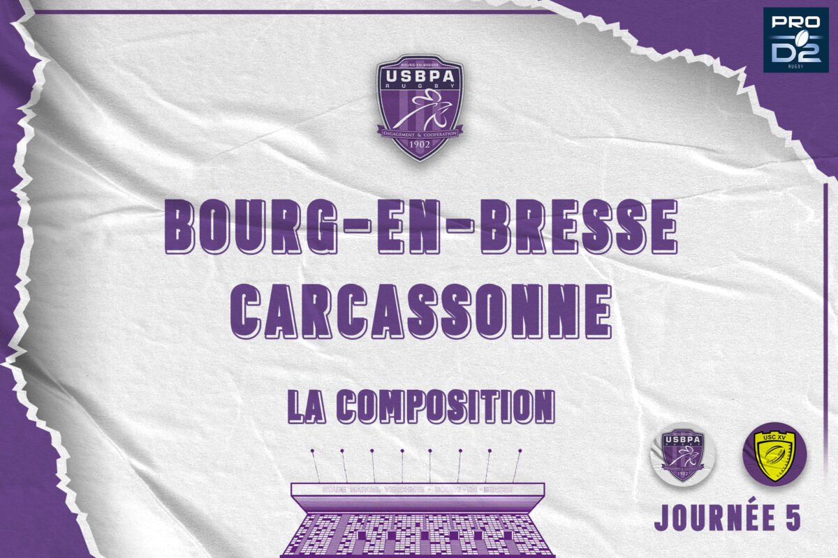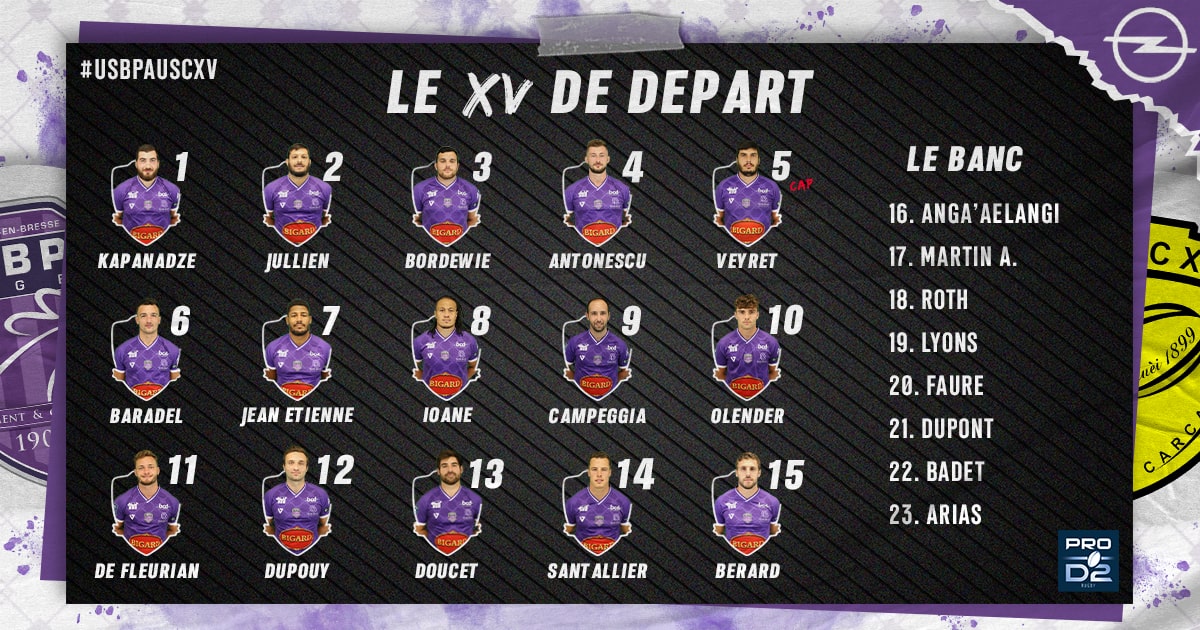 Opel Mondial Autos, concession à Péronnas, vous présente la composition d’équipe de l’USBPA Rugby pour la réception de Carcassonne demain à 19h30 au stade Marcel Verchère pour le compte de la 5ème journée de Pro D2 !