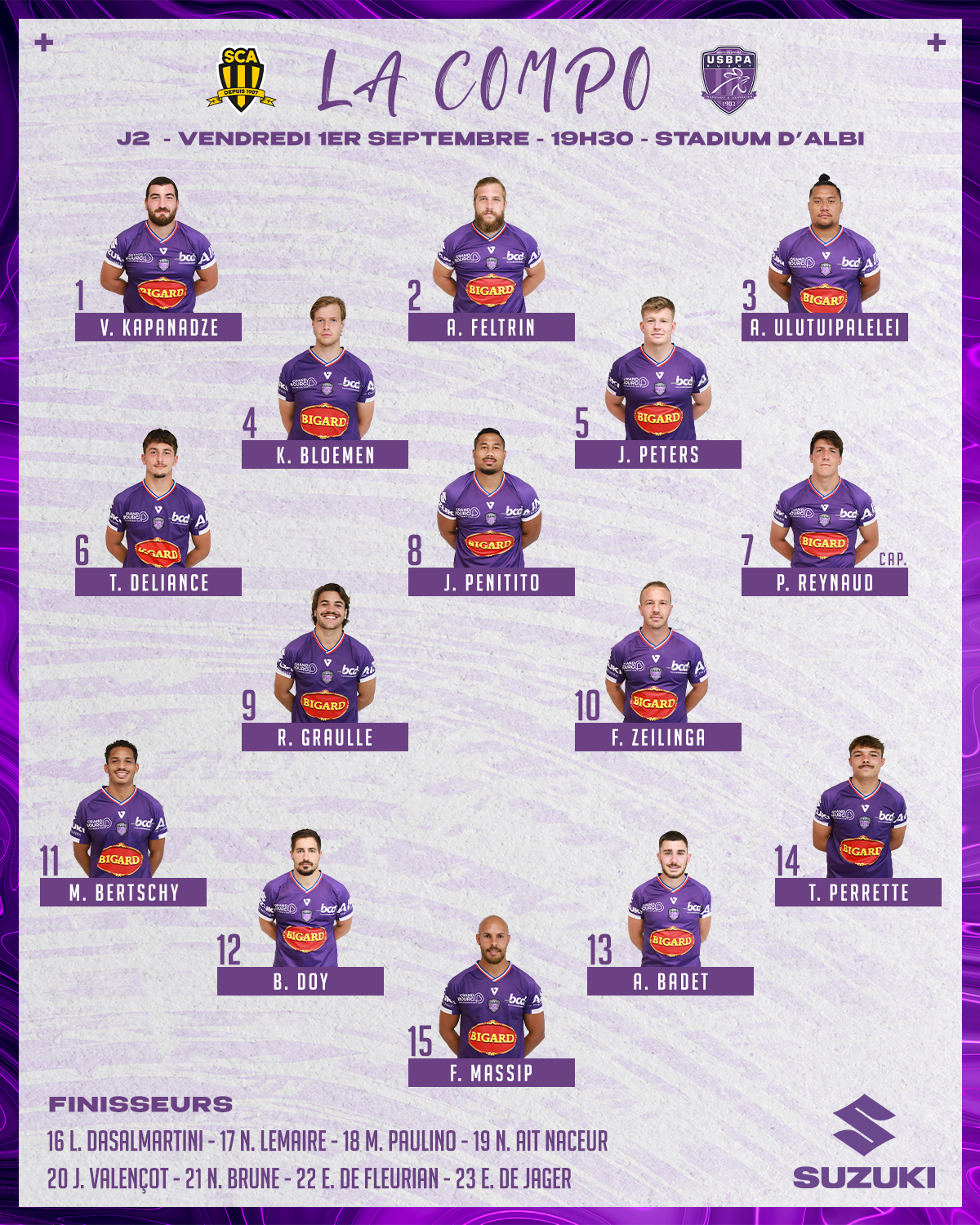 Notre Fournisseur Officiel le Garage Meunier Suzuki – Viriat vous présente la composition des Violets pour le déplacement à Albi ! Le match sera diffusé sur notre chaine YouTube, en direct ! Nous mettons tous les moyens en œuvre pour vous offrir les images de la rencontre.