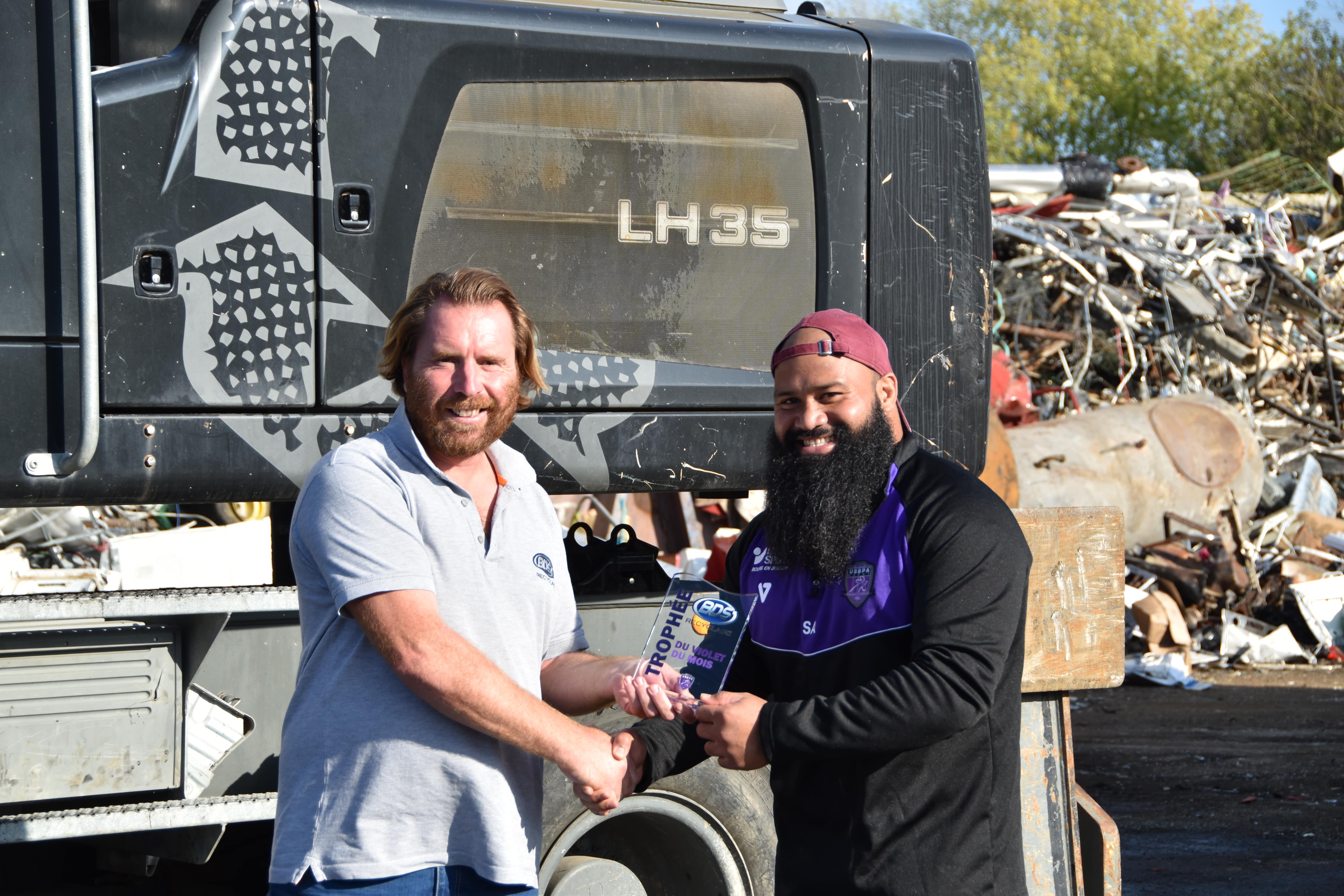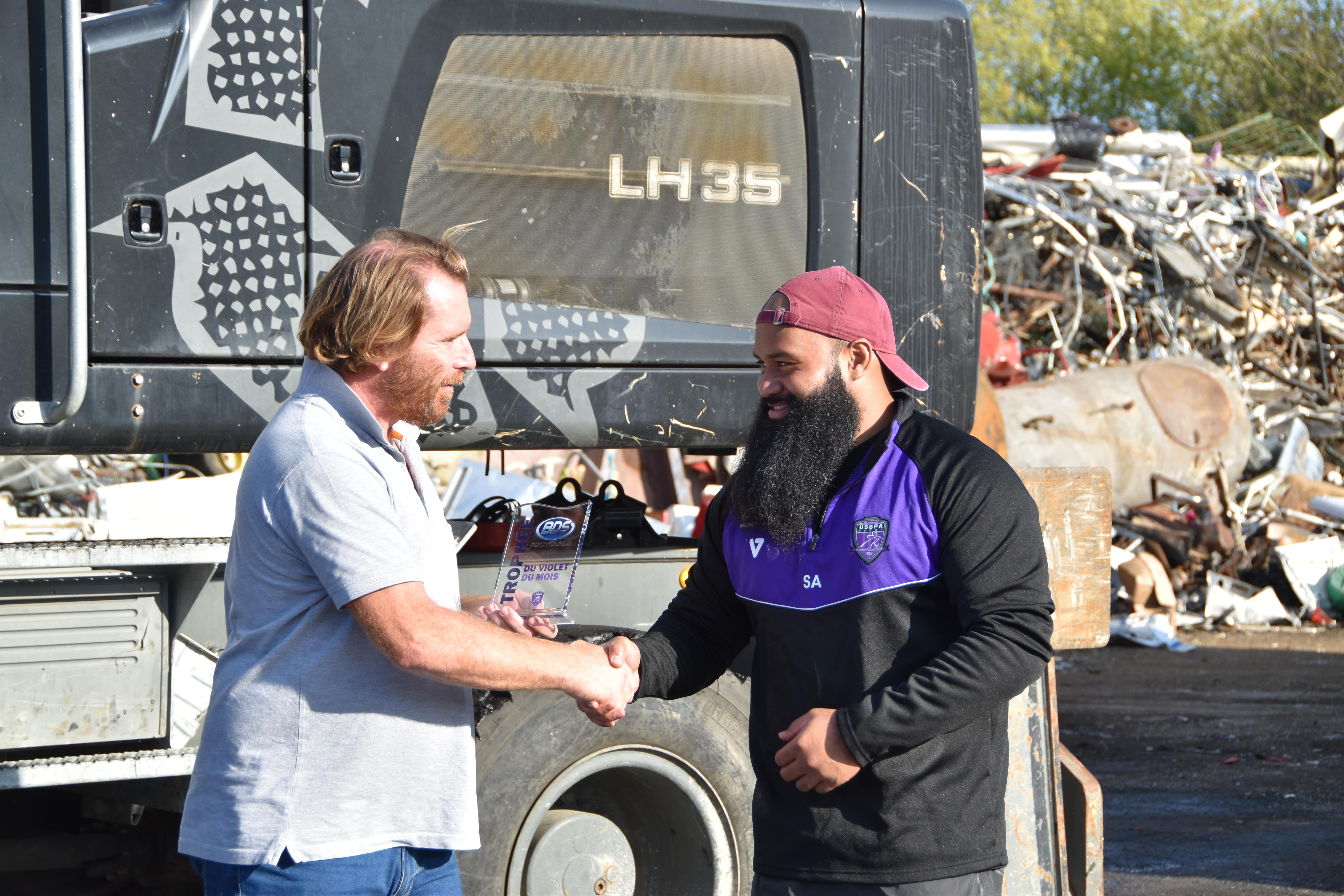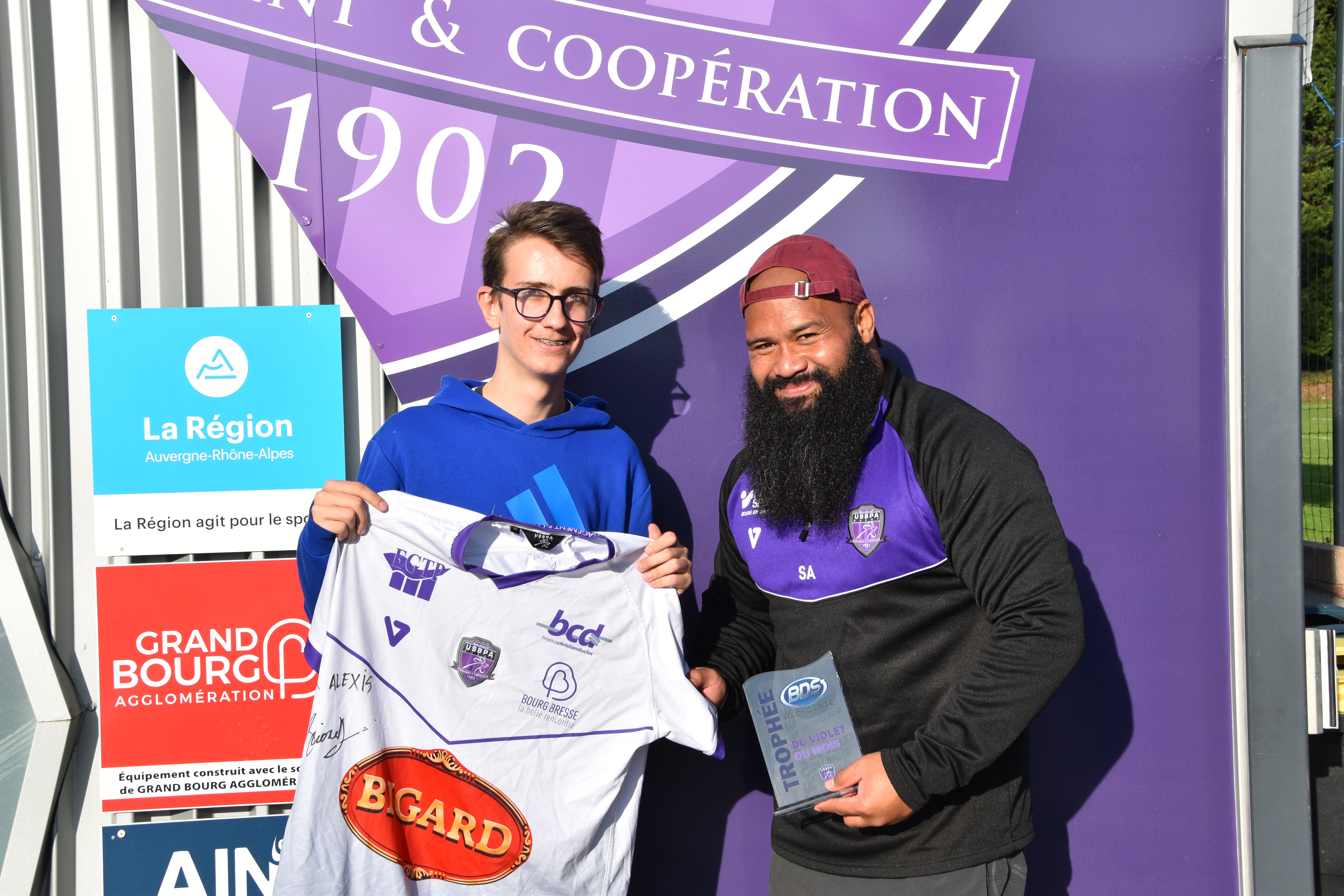 Notre Violet du mois, Sione Anga’Aelangi, a reçu son trophée remis par notre partenaire BDS Recyclage ! Il en a profité pour remettre à son tour le cadeau à notre abonné du mois de septembre, Alexis, qui a remporté le maillot porté et dédicacé de Sione !