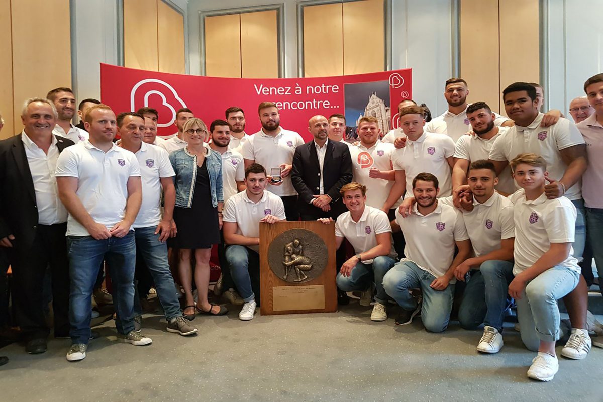 Vendredi 21 juin en début de soirée, les Espoirs de l’USBPA, champions de France, ont été reçus en Mairie. En effet, M. Debat, maire de Bourg-En-Bresse et Président de la Communauté d’Agglomération du Bassin de Bourg-En-Bresse, ainsi que Mme Courtine, maire-adjointe déléguée aux Sports, avaient convié nos jeunes à une cérémonie à l’Hôtel de Ville. Les élus ont remis la médaille omnisports de la Ville de Bourg-En-Bresse, ainsi que le trophée de la « Belle Rencontre » aux deux co-capitaines des Espoirs, afin de récompenser le club d’avoir véhiculé une image positive et active de notre bassin de vie.
