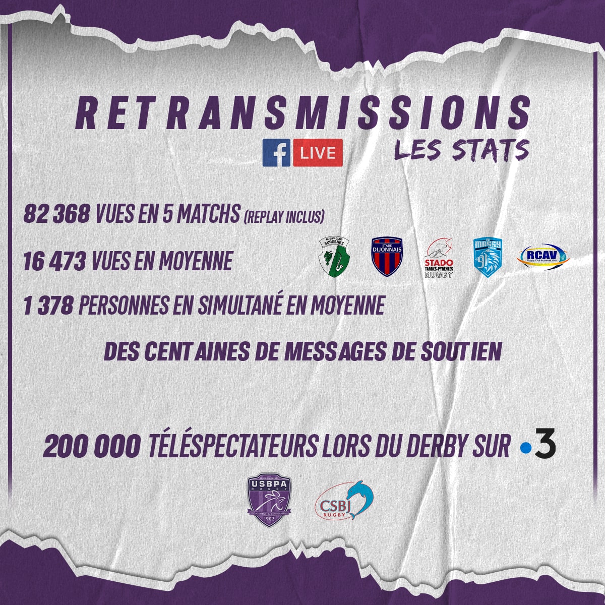 Depuis l’instauration des huis clos, l’USBPA a joué 6 rencontres à domicile, dont 5 retransmises sur Facebook Live et une sur France 3 Régions ! Cela permet de faire vivre les rencontres à notre communauté de supporters mais également d’offrir de la visibilité à nos partenaires via l’affichage publicitaire face caméra, les affichages dynamiques (leds et écrans géants) ou encore les logos incrustés sur le live avec des publicités en avant-match ainsi qu’à la mi-temps !