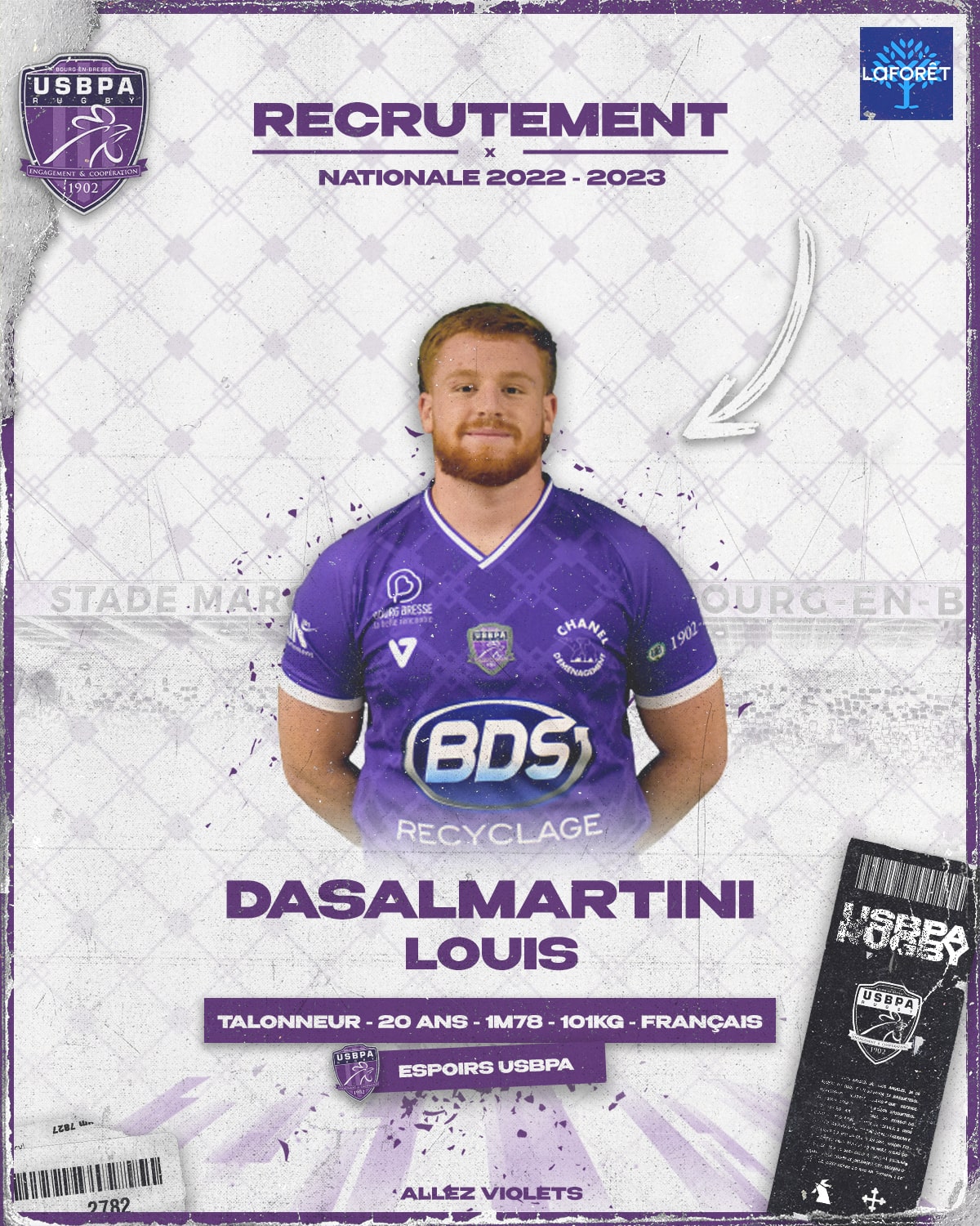 L’USBPA Rugby et son partenaire Laforêt Bourg en Bresse vous annoncent l’intégration de Louis Dasalmartini au groupe professionnel ! Le jeune talonneur de 20 ans est arrivé l’an dernier en provenance du RC Toulon, club dans lequel il a été formé et il a joué 17 rencontres avec nos Espoirs au cours de la saison passée en Reichel.