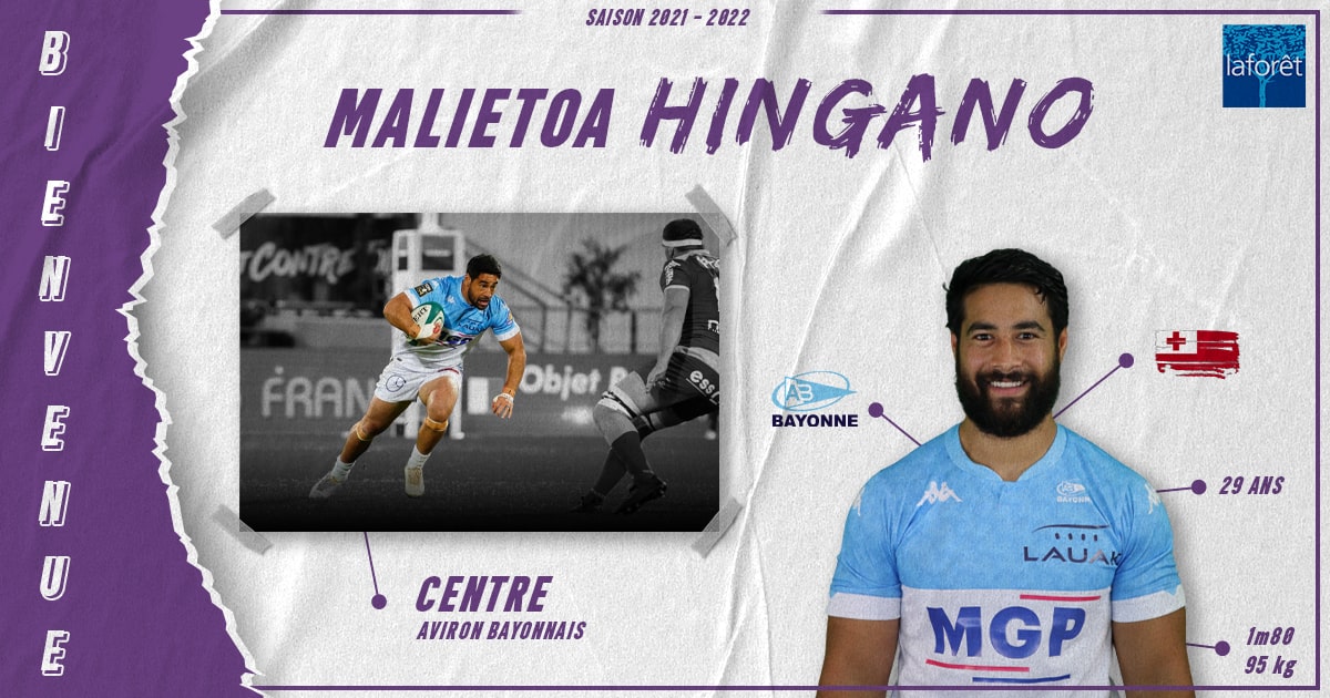 Notre partenaire Laforêt Bourg-en-Bresse vous annonce la signature du 3/4 centre Malietoa Hingano en provenance de l’Aviron Bayonnais Rugby, pour une saison (plus une en option). Malietoa a joué 45 matchs en Top 14 avec les clubs de La Rochelle, du Stade Français et de Bayonne, 12 en coupe d’Europe (Challenge Cup) et 7 avec l’équipe des Tonga (3 lors de la dernière Coupe du Monde au Japon). Il est actuellement sélectionné avec son équipe nationale pour jouer des tests matchs.