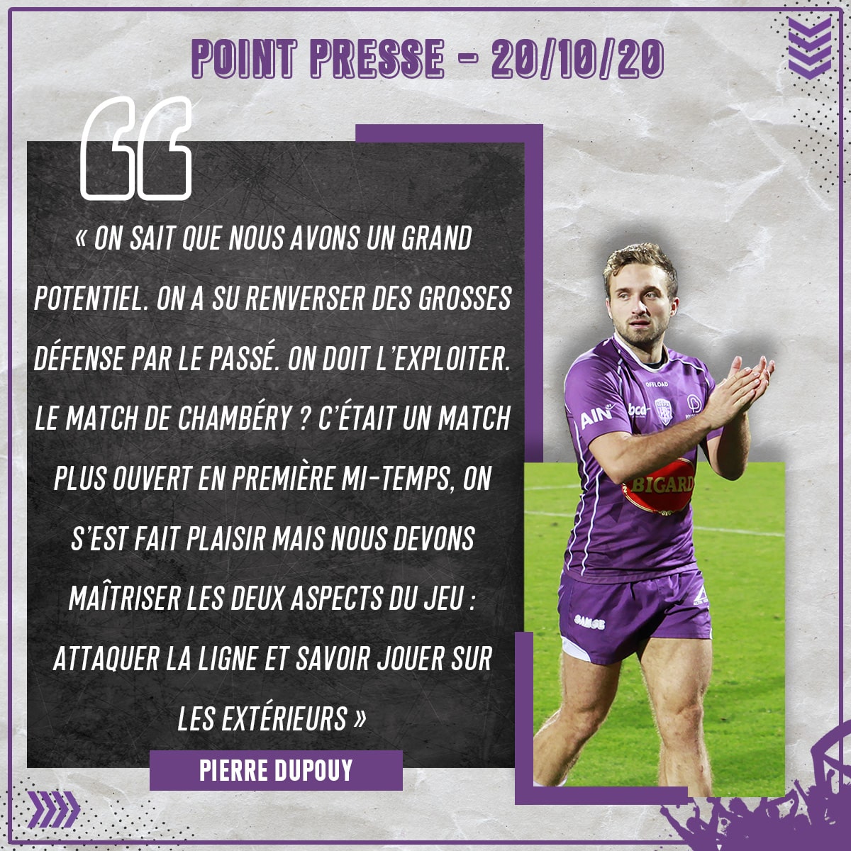 Pierre Dupouy s’exprime sur la rencontre jouée ce week-end face à Chambéry : « Le match précédent ? Pas de pépin pour moi, il faut que l’on évite de rentrer dans une spirale négative avec les blessés ». Ensuite, il enchaîne avec l’opposition de ce week-end : » Je vois ce déplacement comme une opportunité pour montrer que nous sommes performants aussi à l’extérieur. On se doit de montrer un autre visage qu’à Tarbes. On a envie de faire un bon match, de se donner les moyens. Chacun d’entre nous doit être engagé pendant 80 mn ».