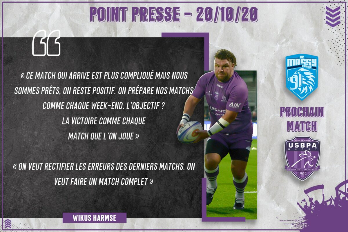 Le pilier Bressan s’exprime sur le match de samedi contre Massy : « Ce match qui arrive est plus compliqué mais nous sommes prêts, on reste positif. On prépare nos matchs comme chaque week-end. L’objectif ? La victoire comme chaque match que l’on joue. On veut rectifier les erreurs des derniers matchs. on veut faire un match complet ».