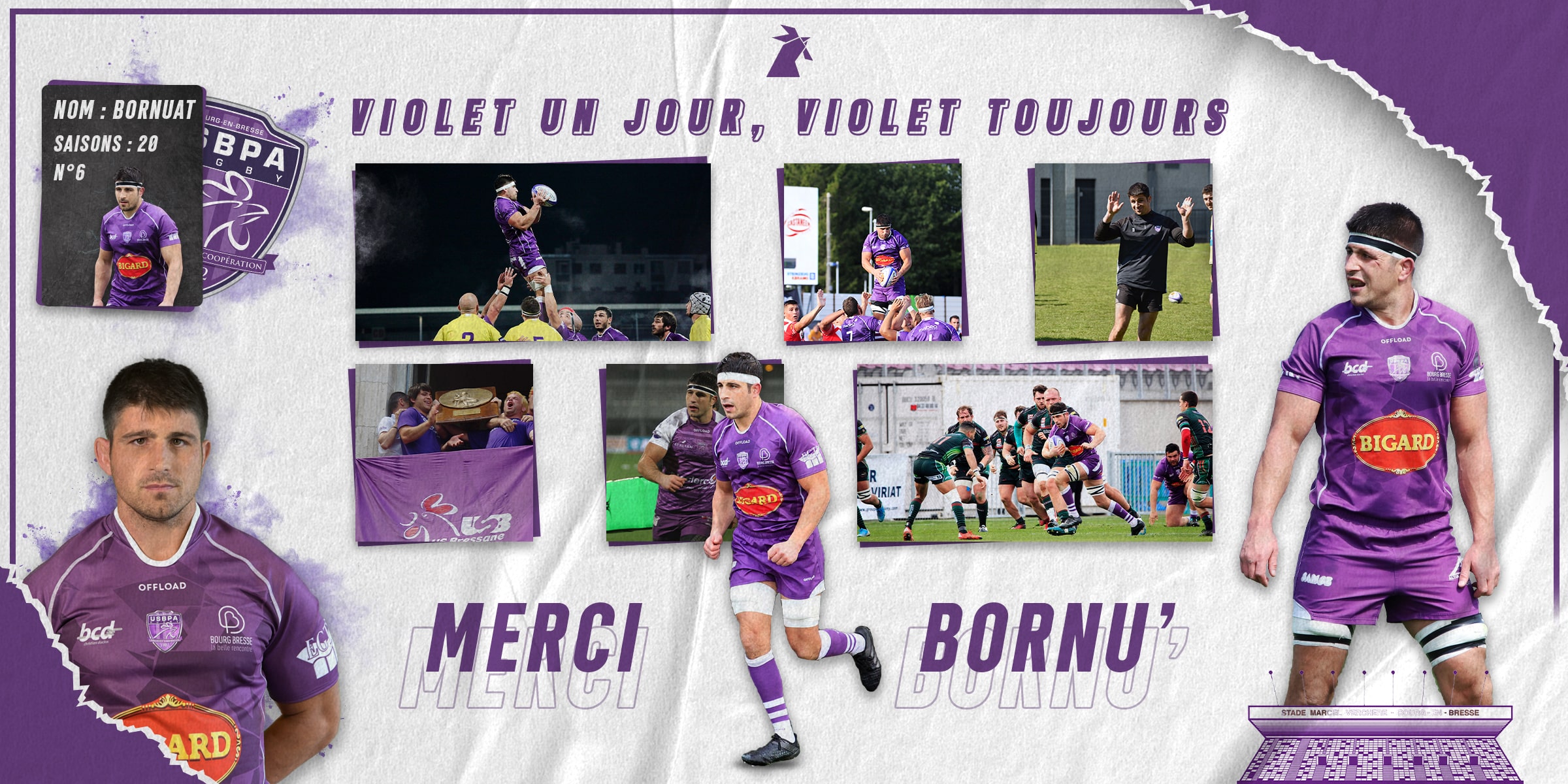 Après 20 saisons passées à l’USBPA Rugby, Simon Bornuat tire sa révérence ! Simon a porté le maillot Violet pour la première fois à l’âge de 6 ans, maillot que portaient déjà son père ainsi que son frère.