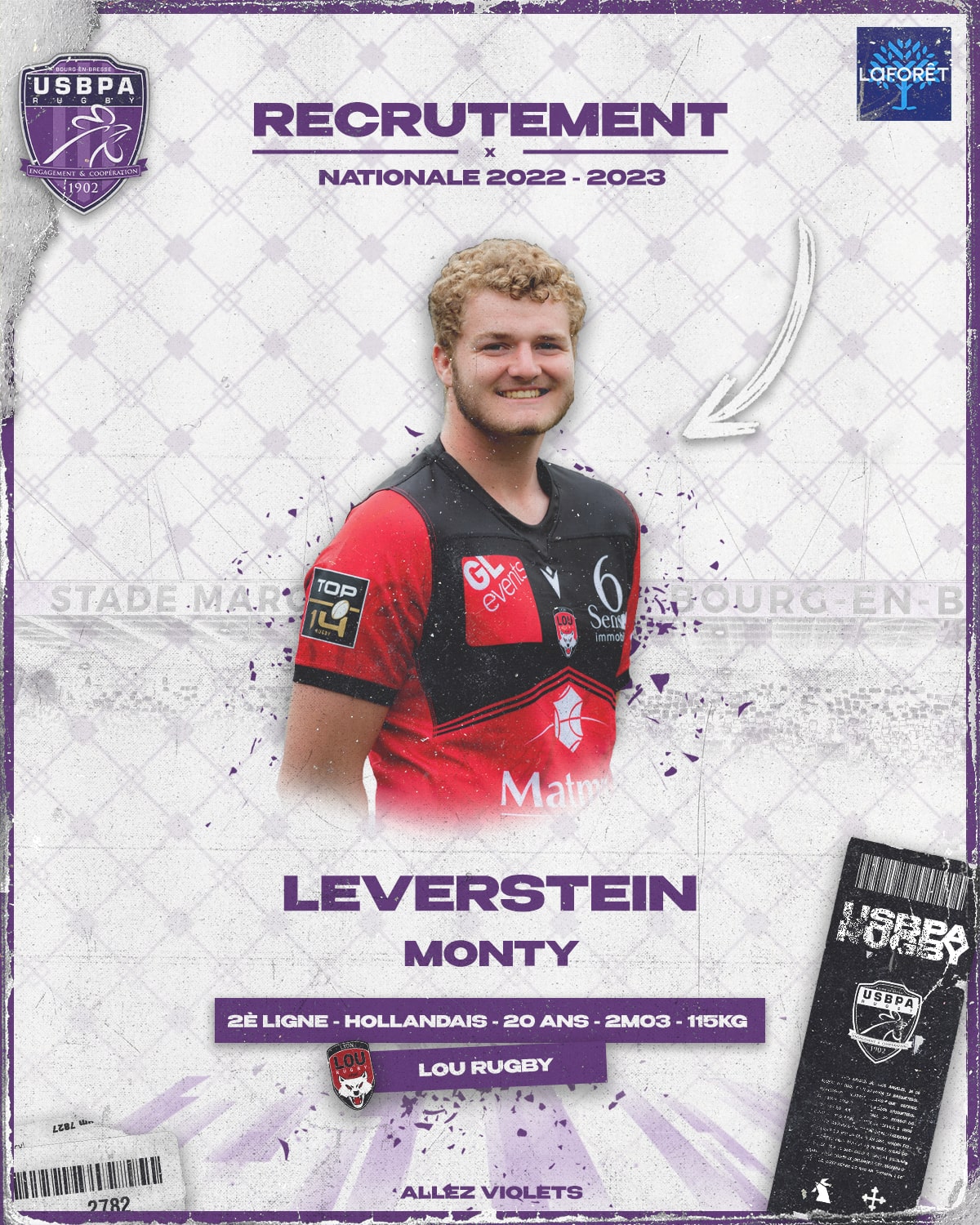L’USBPA Rugby et son partenaire Laforêt Bourg en Bresse vous annoncent la signature de Monty Leverstein chez les Violets, en provenance du LOU Rugby pour les deux prochaines saisons (+1 en option). Le jeune homme de 20 ans évoluera au poste de deuxième ligne !