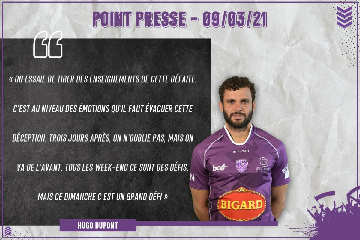 Hugo Dupont nous livre son ressenti quant à la défaite de l’USBPA la semaine passée face au RCME : « On essaie de tirer des enseignements de cette défaite. C’est au niveau des émotions qu’il faut évacuer cette déception. Trois jours après, on n’oublie pas, mais on va de l’avant. Tous les week-end ce sont des défis, mais ce dimanche c’est un grand défi, on n’a pas le temps de tergiverser. C’est un match important car ils sont premiers, quand on est compétiteur, on est content de pouvoir les affronter et de se mesurer à eux ».