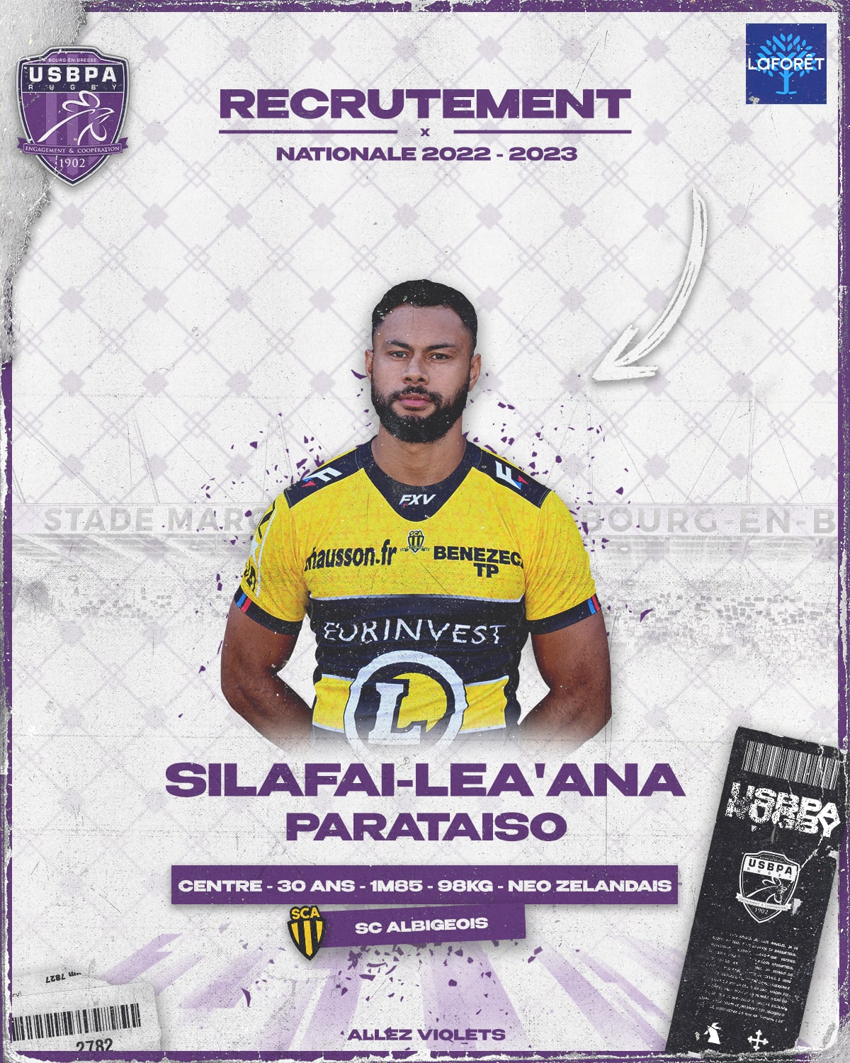 L’USBPA Rugby et son partenaire Laforêt Bourg-en-Bresse vous annoncent la signature de Parataiso Silafai-Lea’Ana, en provenance du SC Albigeois ! Passé par Melbourne, Grenoble, Valence-Romans, Nice puis Albi, « Taiso » évoluera à Bourg au poste de Centre, pour les deux prochaines saisons !