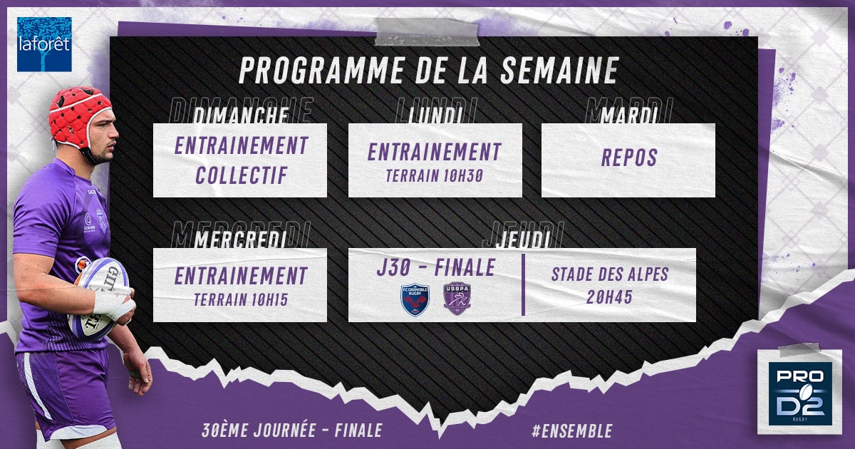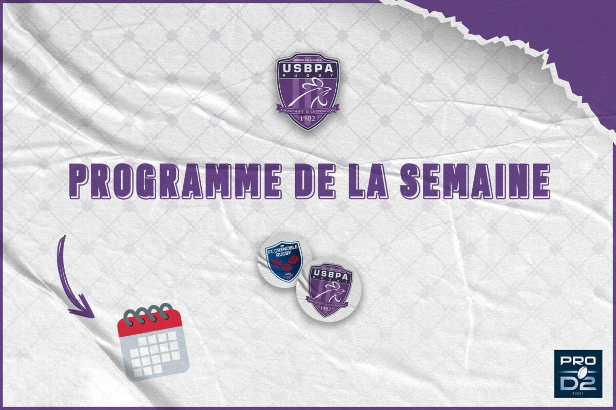 Dernière semaine de championnat de Pro D2 : les Violets iront jouer le maintien à Grenoble ! Ce jeudi, 20h45, l’USBPA Rugby affronte le FCG pour le compte de la J30. Nous vous communiquerons les informations relatives au déplacement dans la journée. Découvrez le programme :