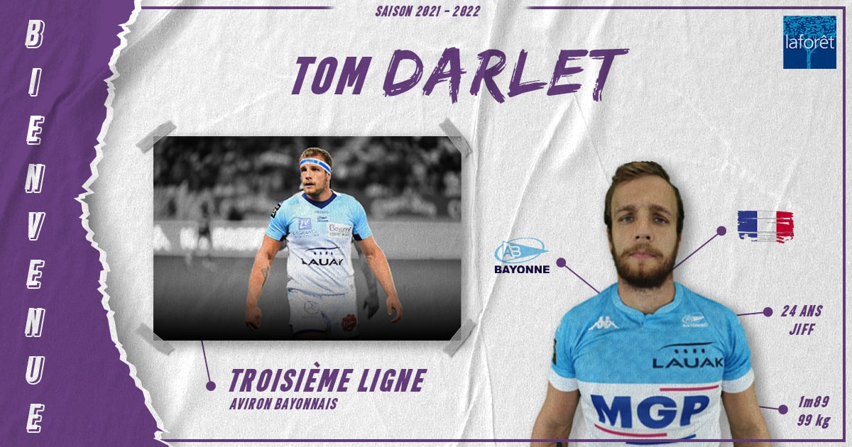 Notre partenaire Laforêt Bourg-en-Bresse vous annonce la signature du troisième ligne Tom Darlet en provenance de l’Aviron Bayonnais Rugby, pour une année. Le joueur de 24 ans a joué trois saisons à Bayonne et a pu côtoyer le plus haut niveau avec 8 matchs de Top 14, 4 de Pro D2 et 3 de Challenge Cup ! Nous lui souhaitons la bienvenue en Bresse !