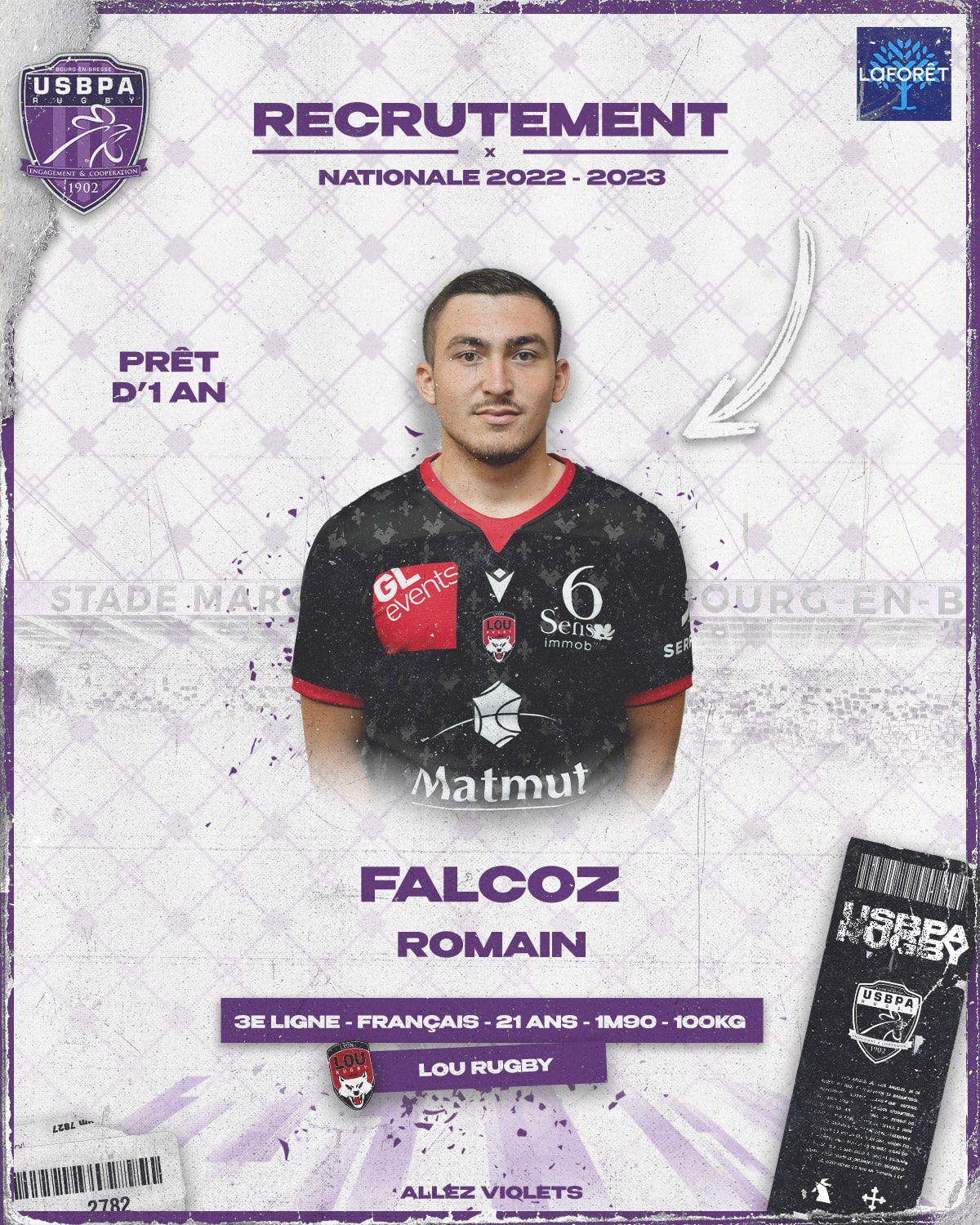 C’est désormais officiel ! L’USBPA Rugby et son partenaire Laforêt Bourg en Bresse vous annoncent le prêt du 3ème ligne Romain Falcoz, en provenance du LOU Rugby ! Le jeune homme de 21 ans a joué au plus haut niveau la saison passée avec le club Lyonnais (2 matchs de Top 14) et à même eu l’opportunité d’être titularisé lors d’un match de Challenge Cup, compétition remportée par le LOU. Bienvenue en Bresse Romain !