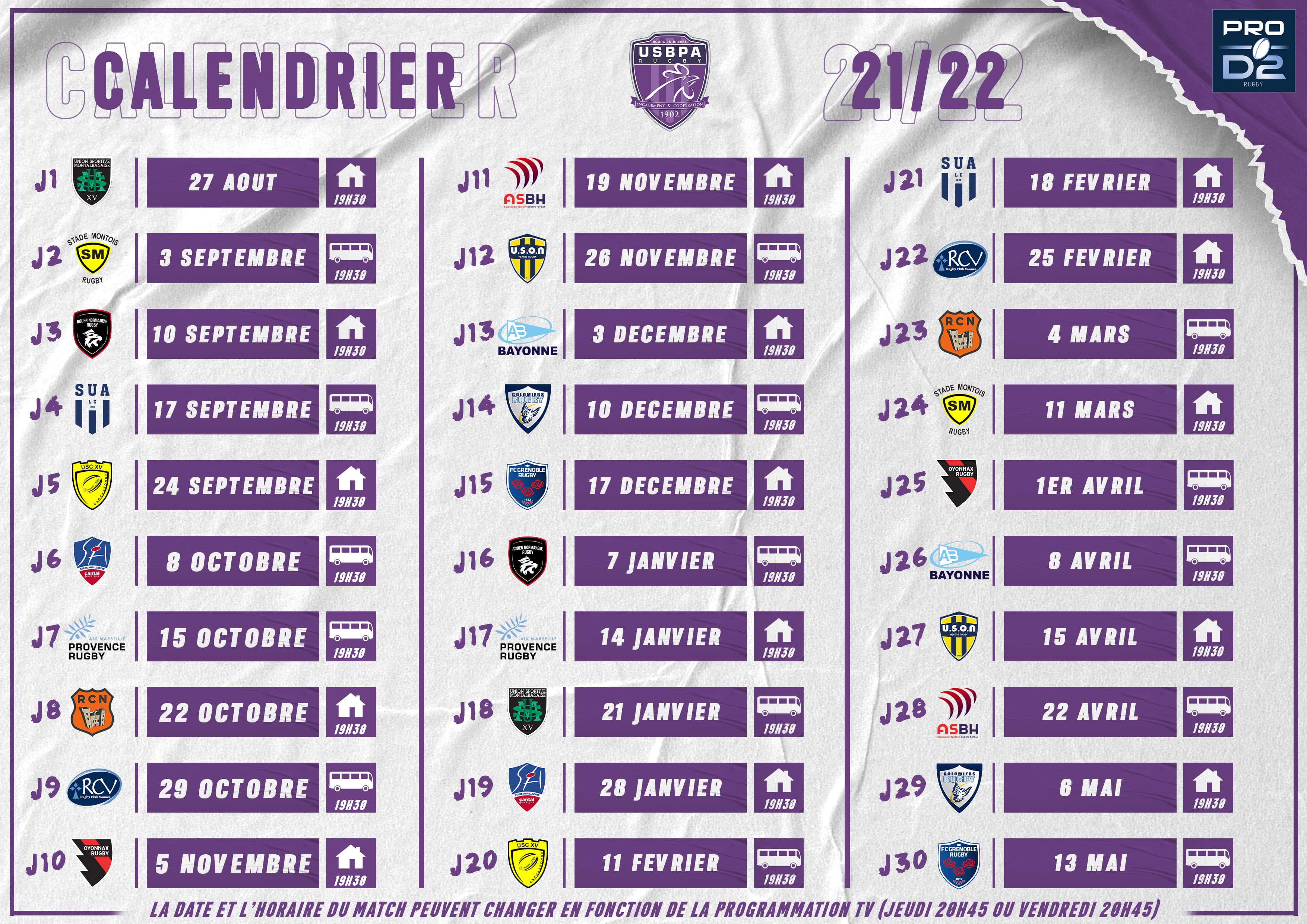 Retrouvez le calendrier des Violets avec toutes les dates des rencontres de la saison de Pro D2 version 2021-2022 !
