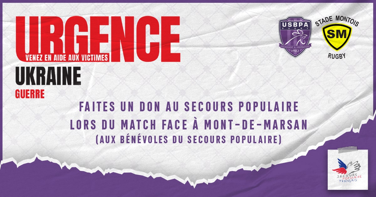 A l’occasion de la rencontre face au Stade Montois, des bénévoles du Secours populaire seront présents pour récolter des dons afin de venir en aide aux victimes de la guerre qui se déroule actuellement en Ukraine. « Le Secours populaire français fidèle à ses valeurs, celles de la déclaration universelle des Droits de l’Homme, soutient au plan matériel, sanitaire, moral et juridique, les personnes et leurs familles victimes de l’arbitraire, de l’injustice sociale, des calamités naturelles, de la misère, de la faim, du sous-développement, des conflits armés ».