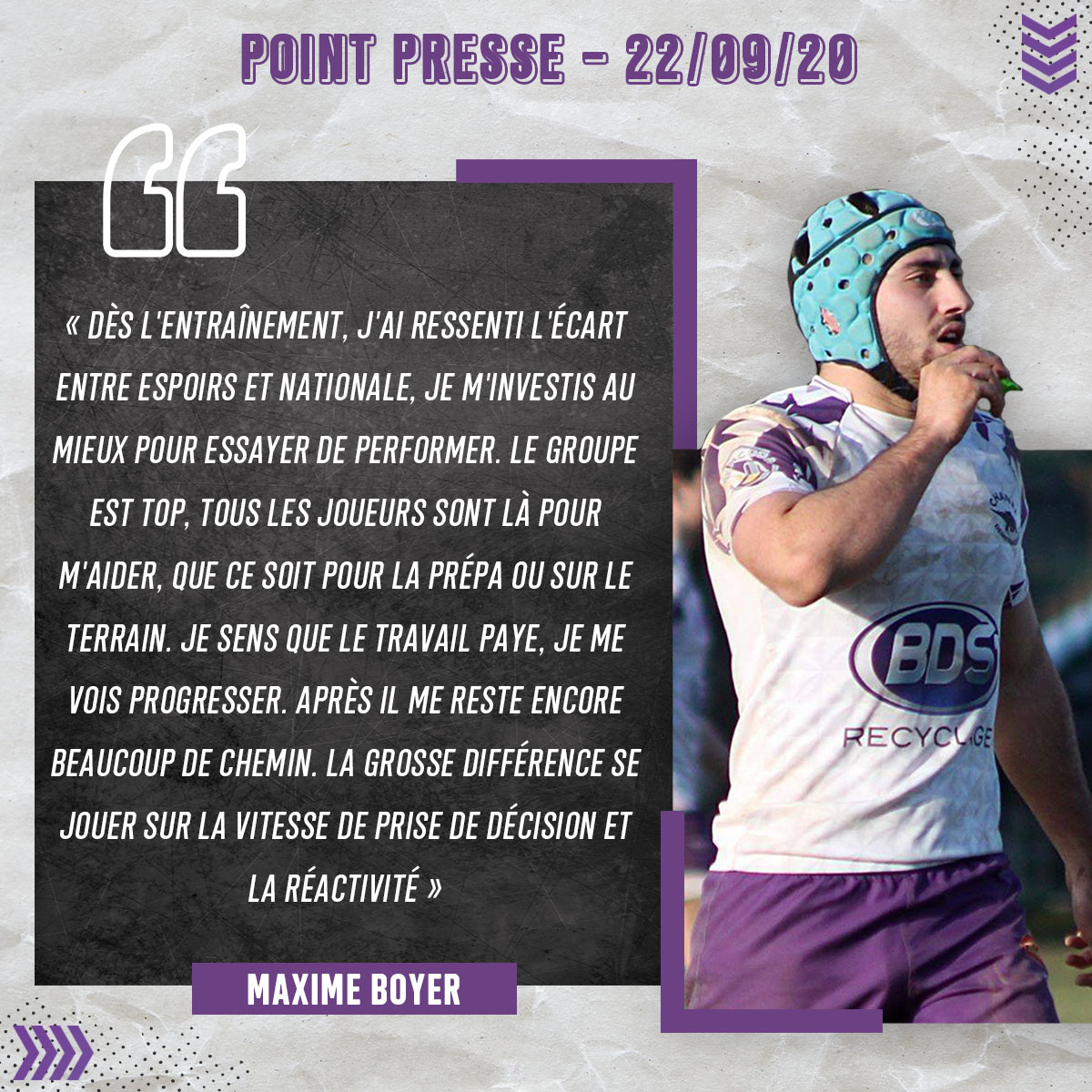 Le jeune trois-quart, formé au club, revient sur ses premières minutes en « une » : « Dès l’entraînement, j’ai ressenti l’écart entre Espoirs et Nationale, je m’investis au mieux pour essayer de performer. Le groupe est top, tous les joueurs sont là pour m’aider, que ce soit pour la prépa ou sur le terrain. Je sens que le travail paye, je me vois progresser. Après il me reste encore beaucoup de chemin. La grosse différence se joue sur la vitesse de prise de décision et la réactivité. Ça reste quand même quelque chose de très plaisant. »