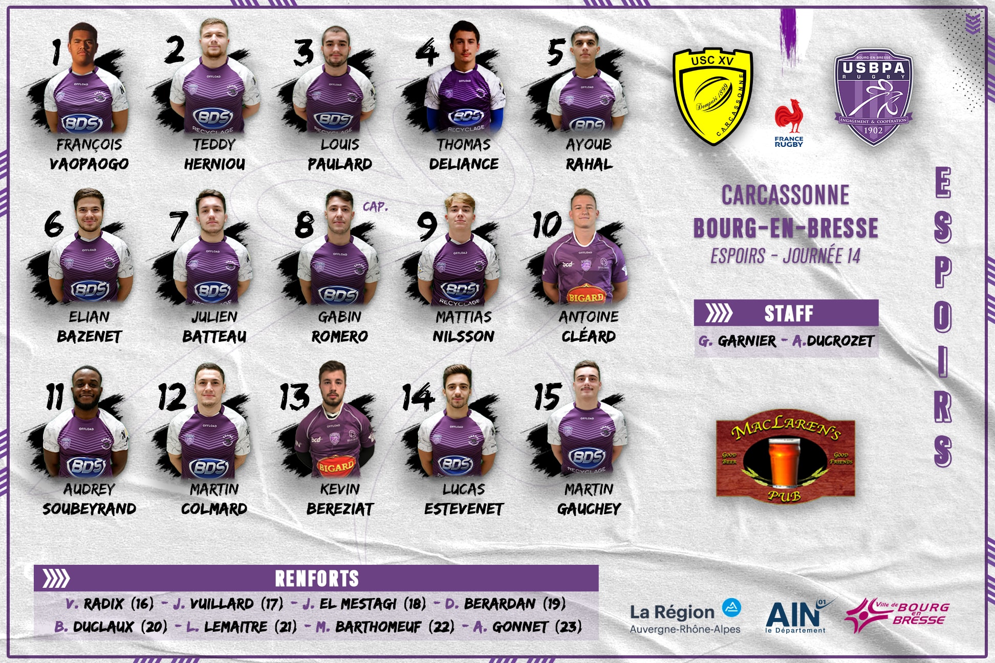 Dimanche, nos jeunes Espoirs terminent leur championnat sur la pelouse de Carcassonne ! Découvrez la composition de l’équipe composée par le staff de l’USBPA !