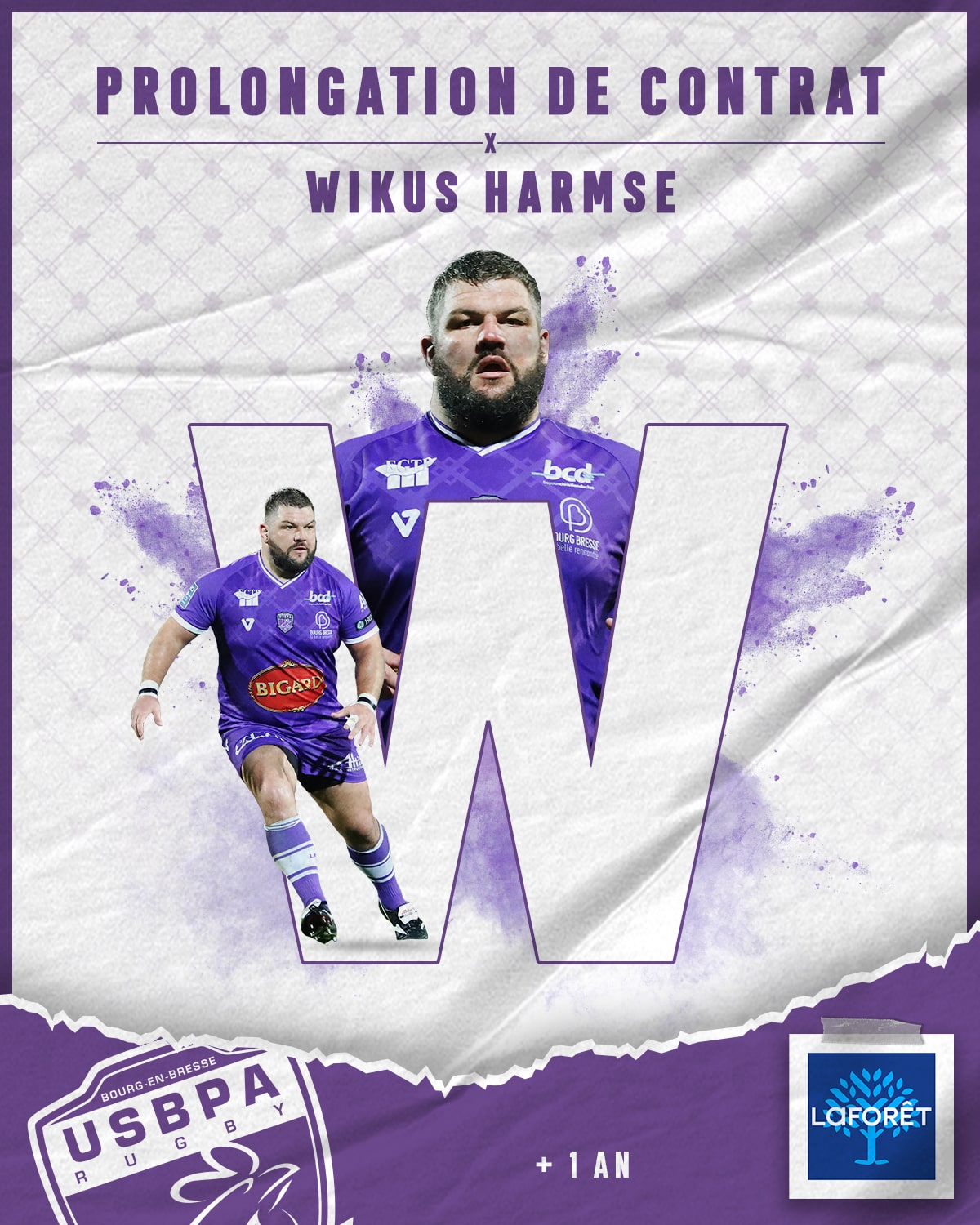 Notre partenaire Laforêt Bourg en Bresse vous informe que Wikus Harmse prolonge avec les Violets pour une saison supplémentaire (Pilier – 37 ans – Non JIFF) !